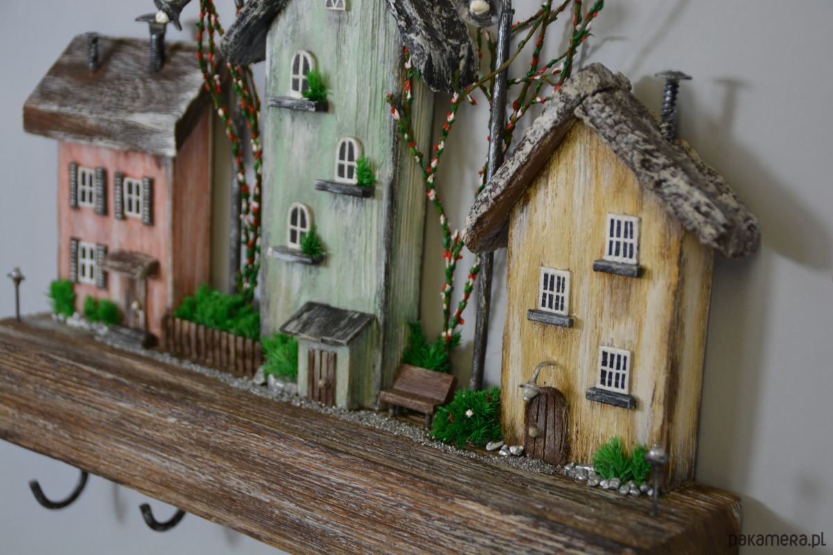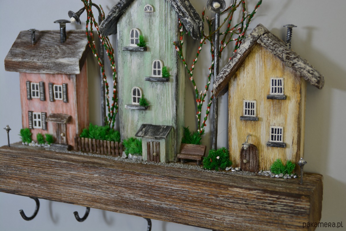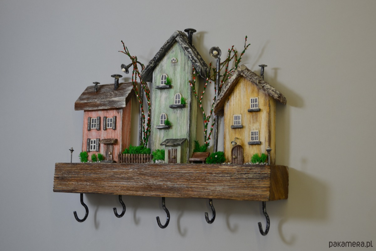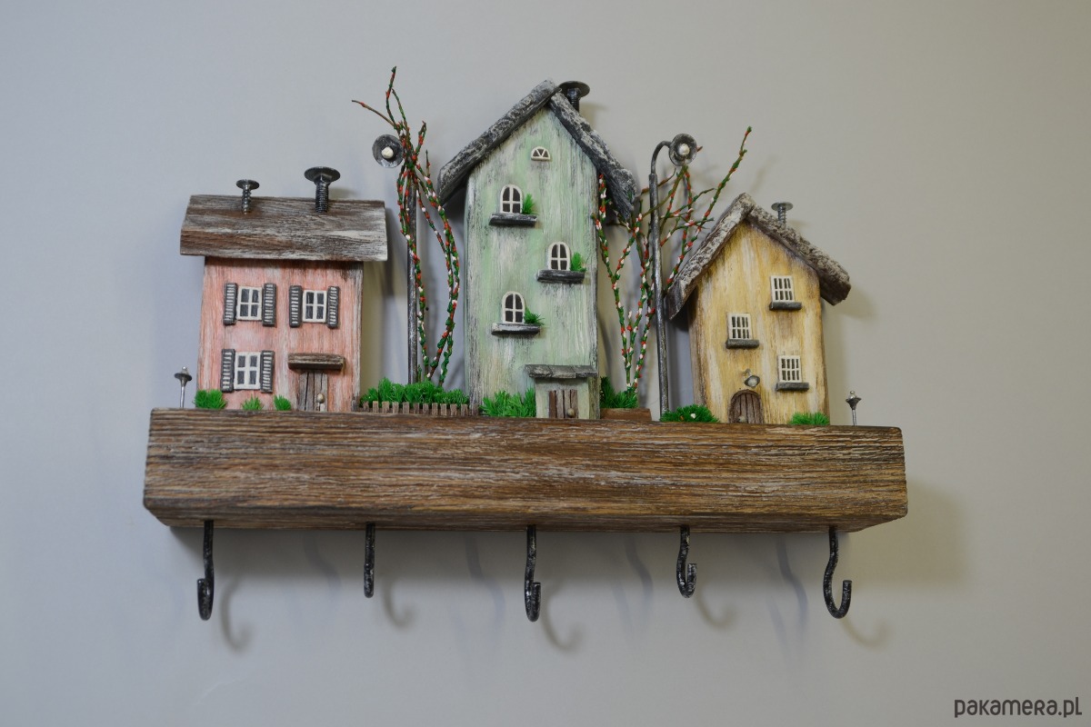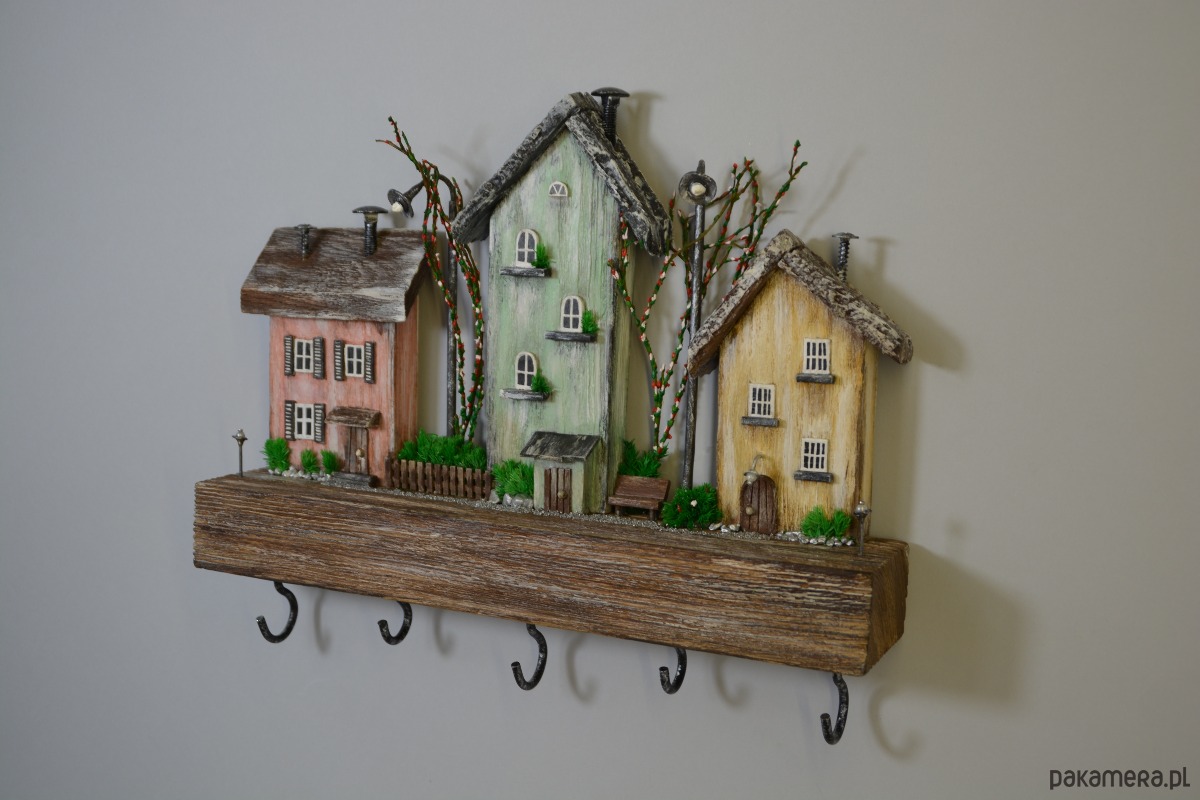 Ten uroczy, ręcznie wykonany wieszak na klucze łączy funkcję praktyczną z dekoracyjną. Składa się z drewnianej belki ozdobionej kilkoma kolorowymi mini domkami – każde domki zostały starannie wyrzeźbione, pomalowane ekologicznymi farbami i zabezpieczone lakierem. Organizator posiada 5 haków do zawieszenia kluczy, co czyni go praktycznym rozwiązaniem do przedpokoju, kuchni lub holu. Dzięki uchwytom montażowym z tyłu łatwo zawiesisz go na ścianie. Ten wieszak będzie świetnym dodatkiem w przedpokoju lub holu, a także pięknym pomysłem na prezent dla miłośników rękodzieła i oryginalnych dekoracji.