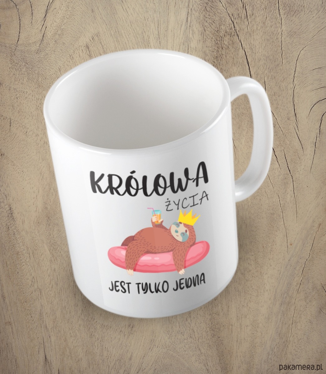 Kolorowy kubek z hasłem: "Królowa życia jest tylko jedna".