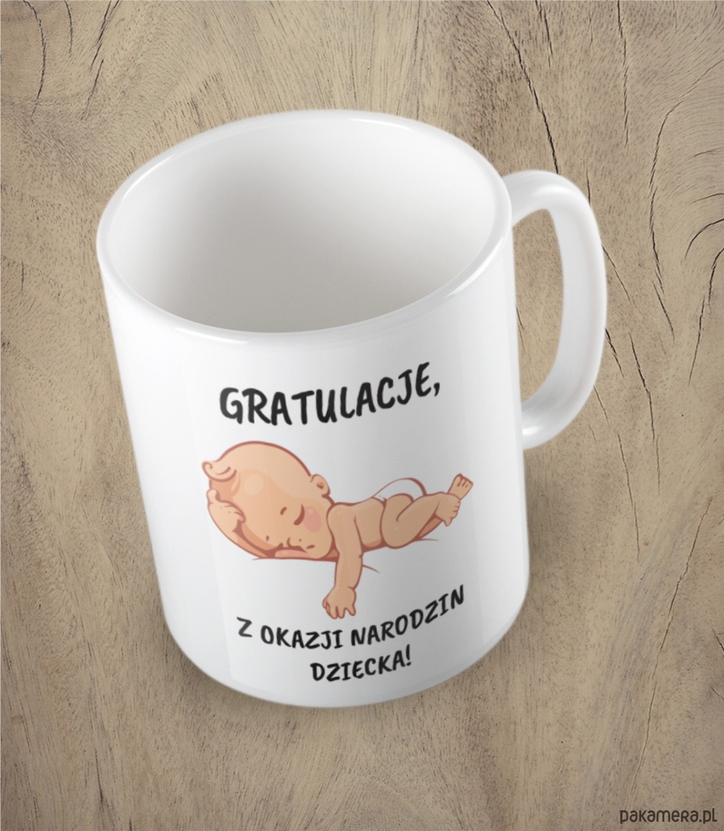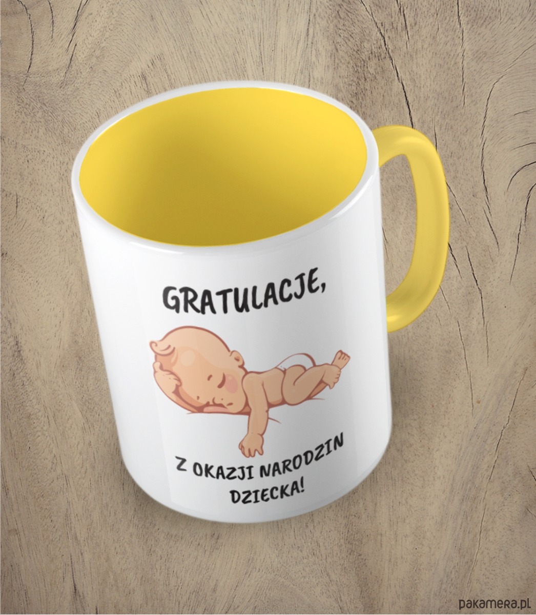 Kolorowy kubek z hasłem: "Gratulacje z okazji narodzin dziecka!" Kubek to idealny pomysł na prezent dla każdego młodego rodzica.