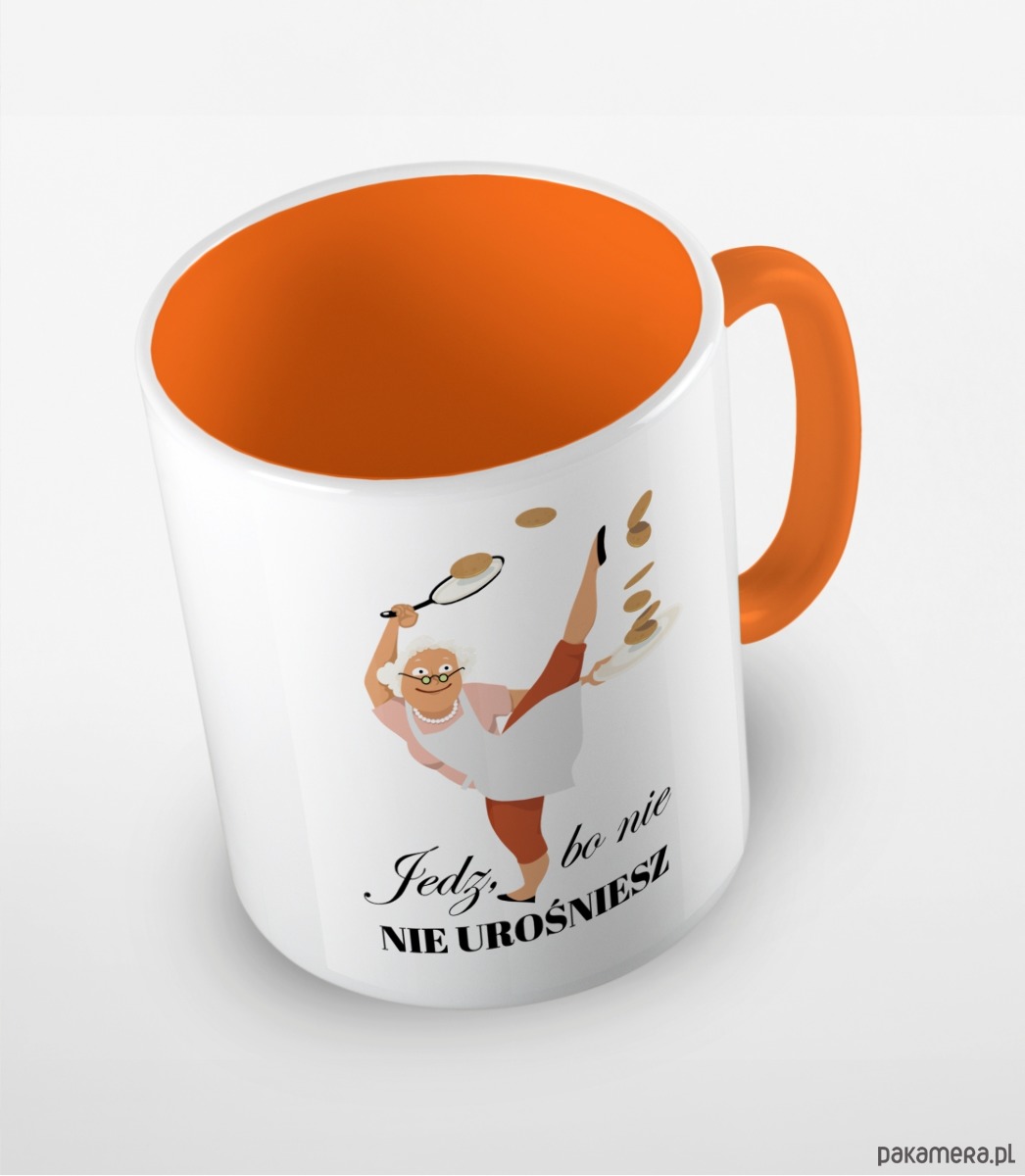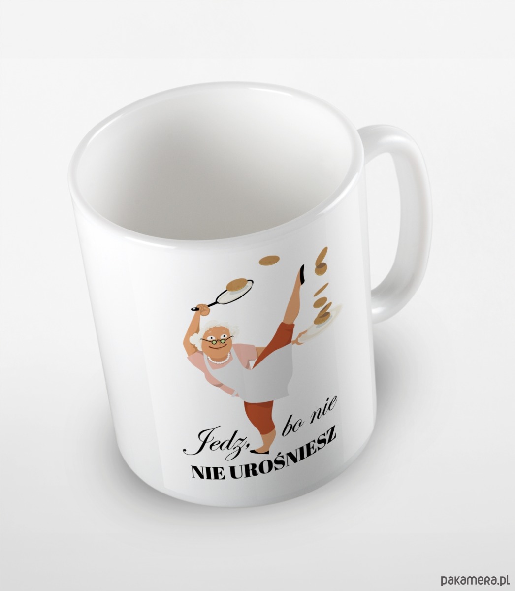 Kolorowy kubek z hasłem: "Jedz, bo nie urośniesz", to idealny prezent z okazji Dnia Babci, bo która babcia tak nie mówiła??