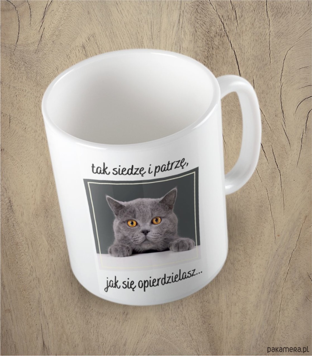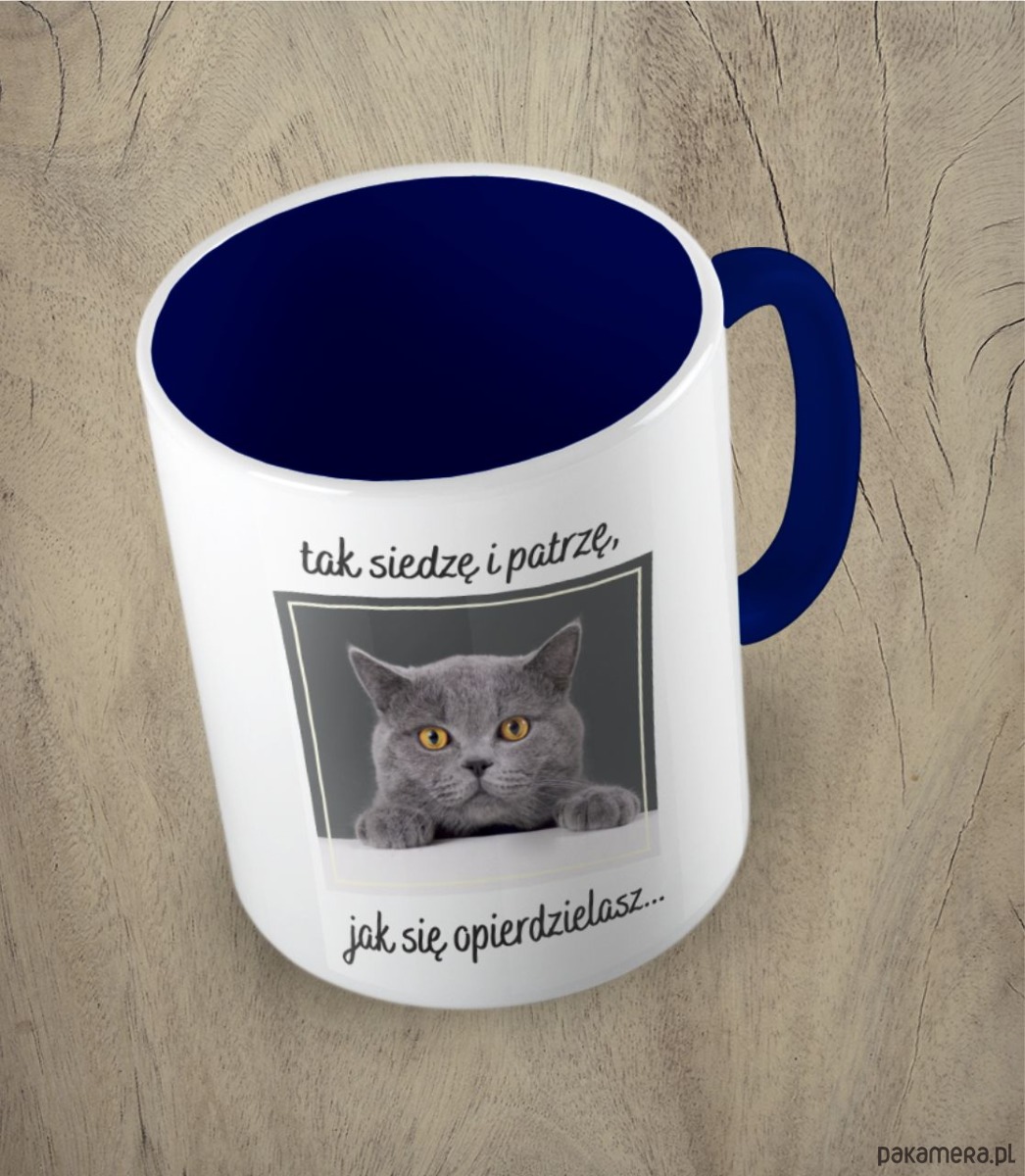 Kolorowy kubek z hasłem: "Tak siedzę i patrzę, jak się opierdzielasz".