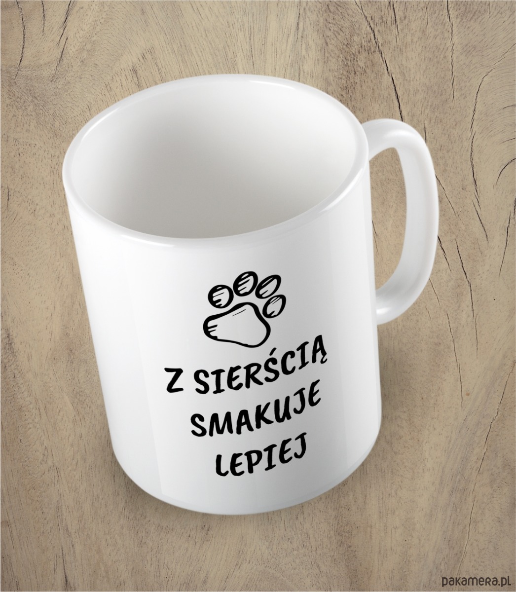 Kolorowy kubek z hasłem "Z sierścią smakuje lepiej". Kubek to idealny pomysł na prezent dla ukochanej osoby.