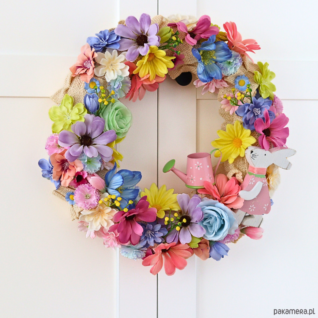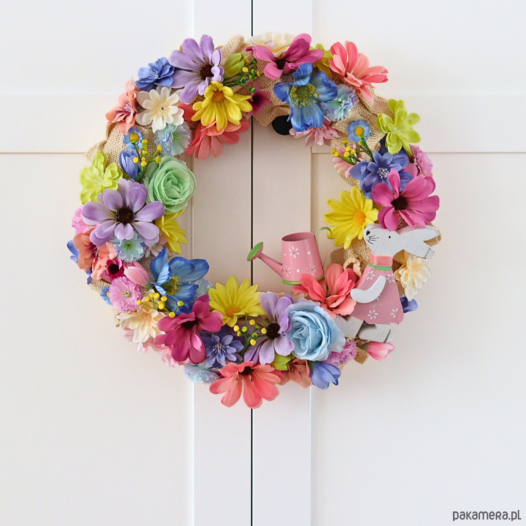 Wianek wielkanocny na drzwi, wianek z zającem do wnętrza.