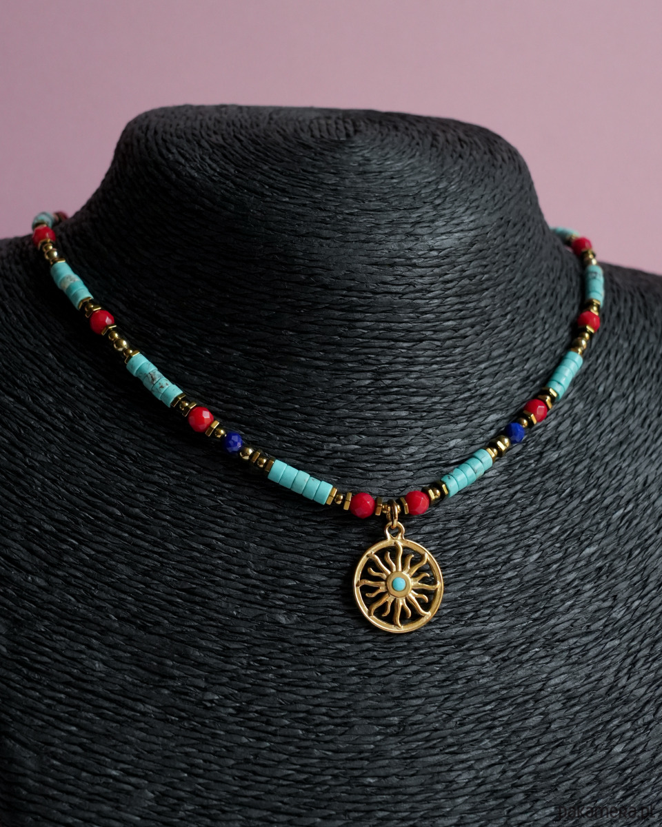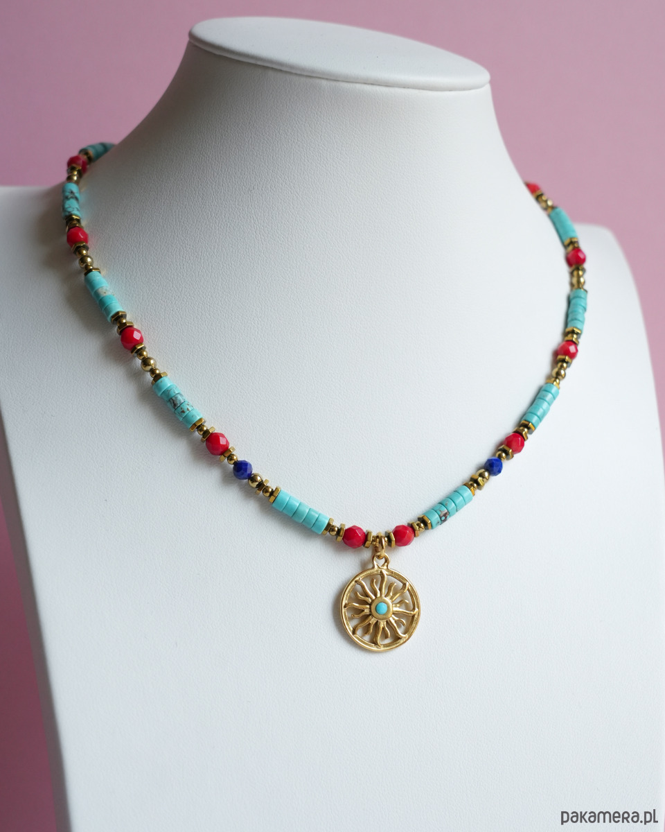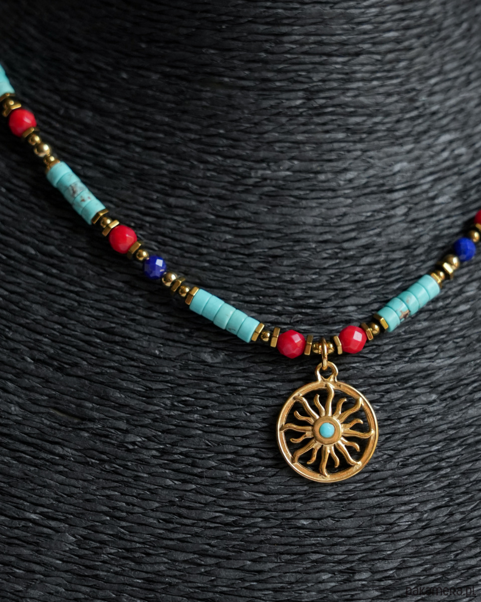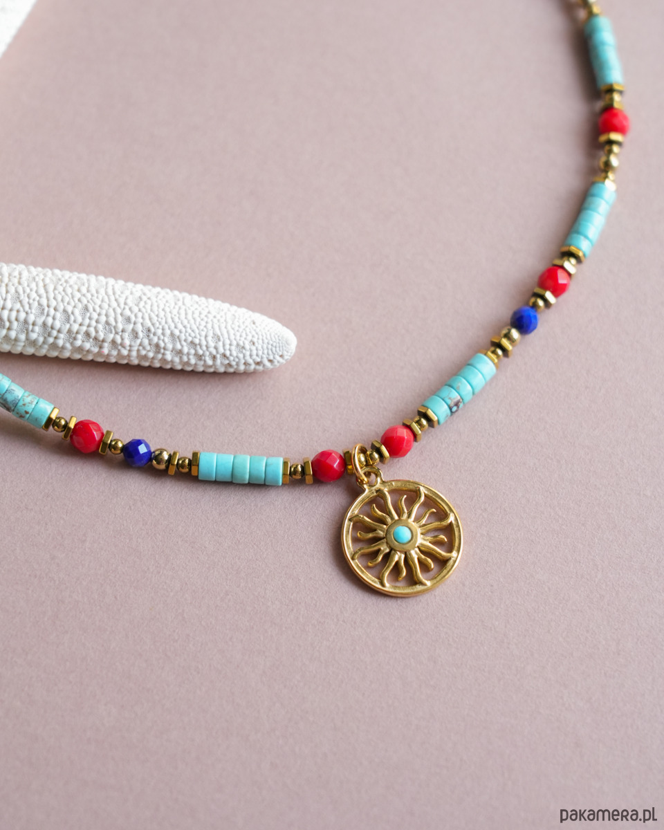 Kolorowy naszyjnik boho z magnezytem, koralem i słońcem