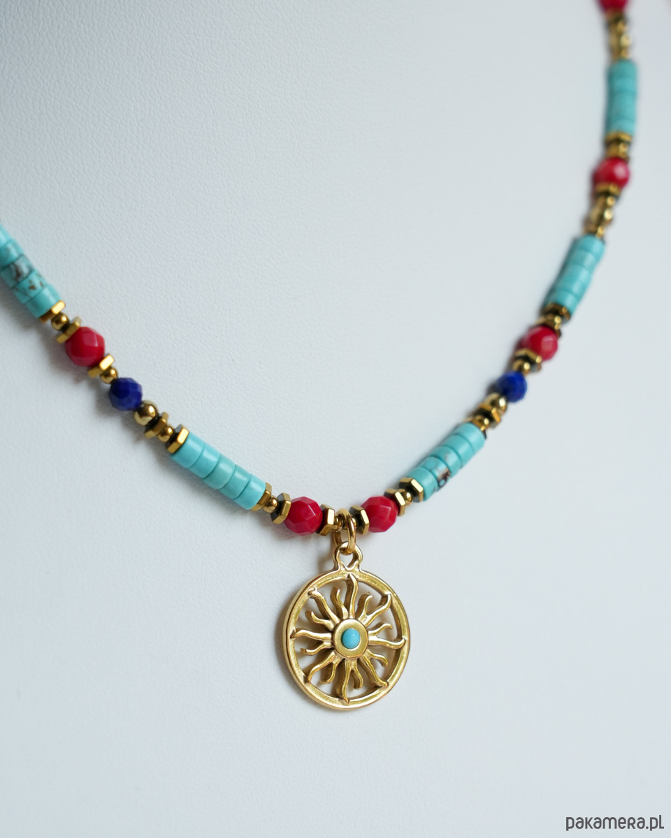 Kolorowy naszyjnik choker w klimacie boho/gypsy/hippie wykonany z niebieskiego MAGNEZYTU, czerwonego KORALA NATURALNEGO, złotego HEMATYTU i granatowego LAPISU LAZULI. Zawieszka w kształcie słońca z niebieskim oczkiem to STAL SZLACHETNA w kolorze złotym. Zapięcie i łańcuszek również wykonane są ze STALI SZLACHETNEJ.