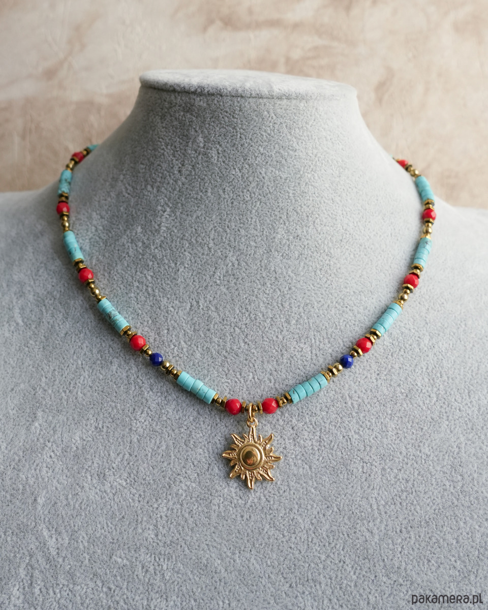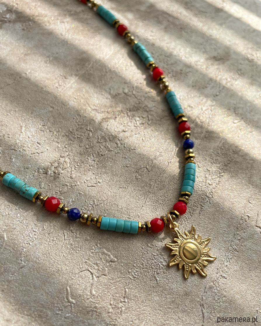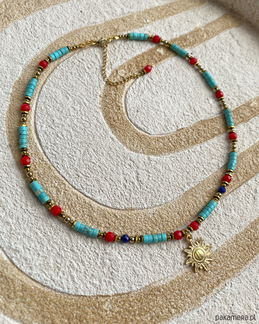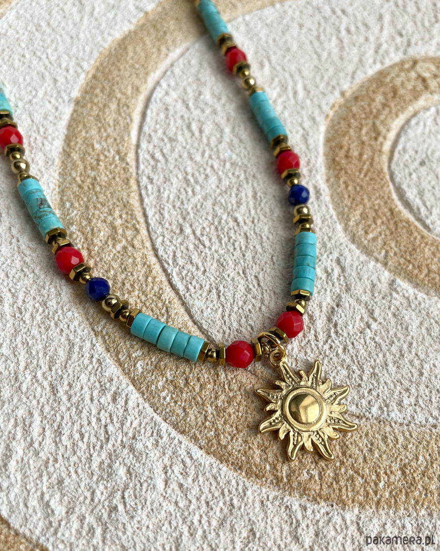 Naszyjnik wykonany jest z niebieskiego magnezytu, czerwonego korala naturalnego, złotego hematytu i granatowego lapisu lazuli. Zawieszka w kształcie słońca to stal szlachetna w kolorze złotym. Zapięcie i łańcuszek również wykonane są ze stali szlachetnej.