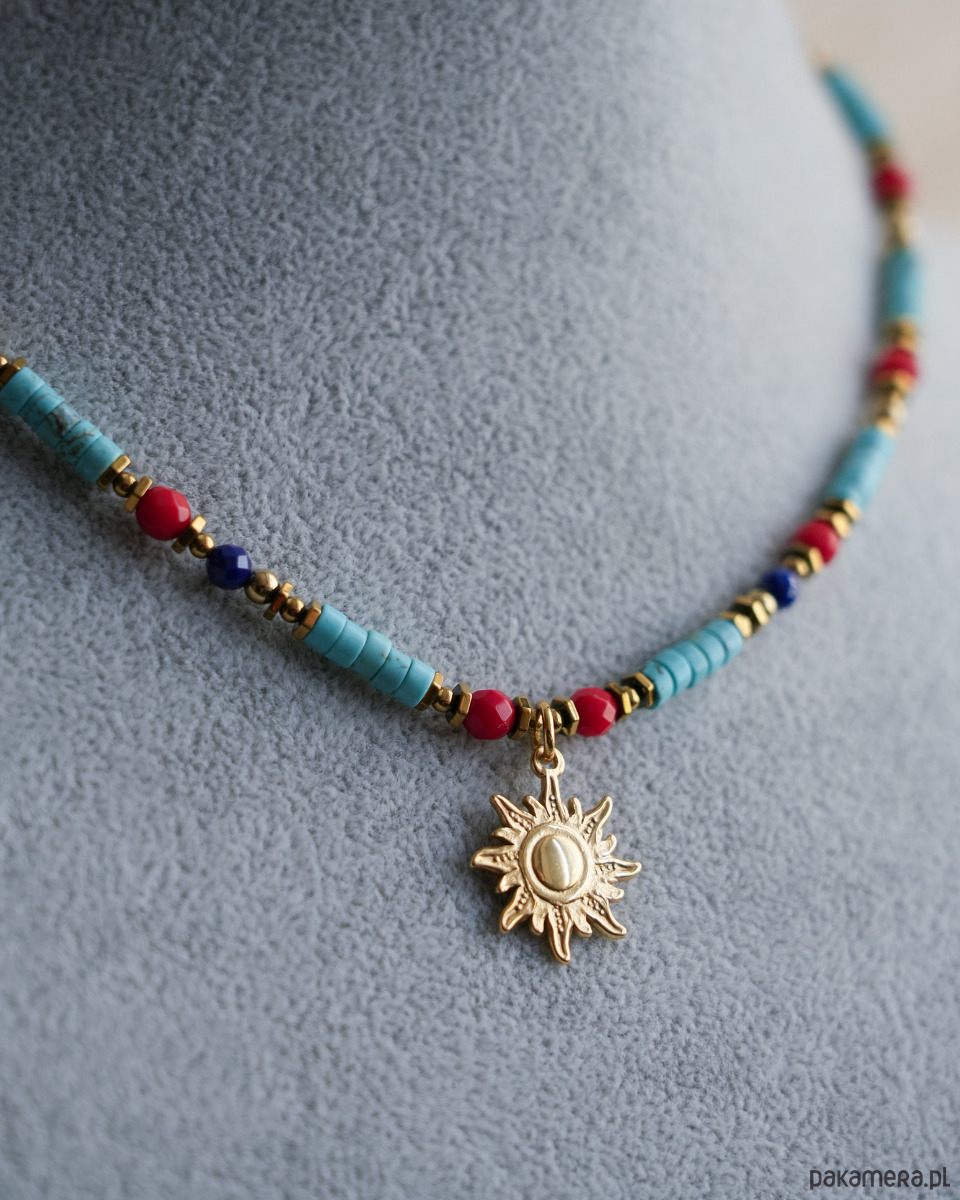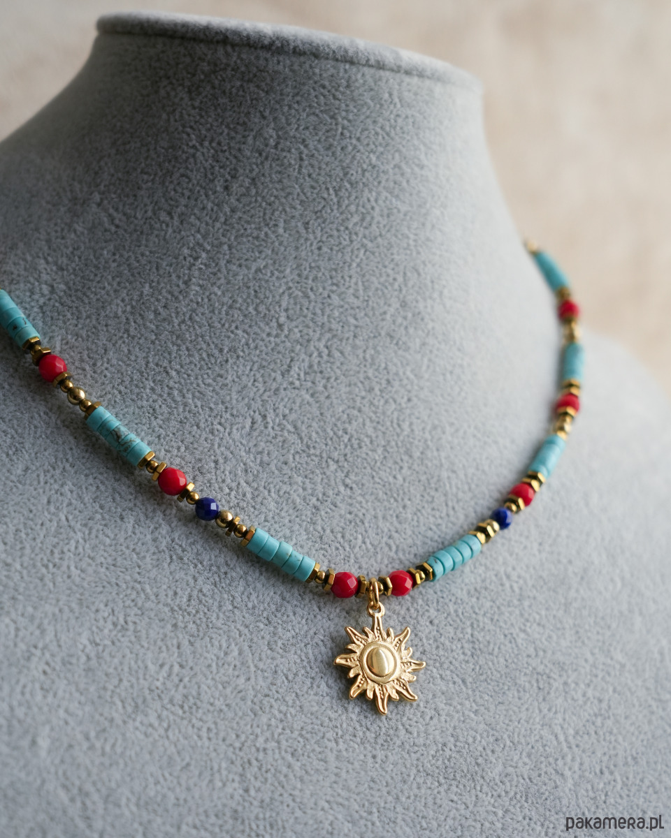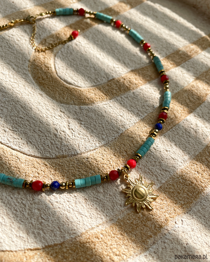 Naszyjnik wykonany jest z niebieskiego magnezytu, czerwonego korala naturalnego, złotego hematytu i granatowego lapisu lazuli. Zawieszka w kształcie słońca to stal szlachetna w kolorze złotym. Zapięcie i łańcuszek również wykonane są ze stali szlachetnej.