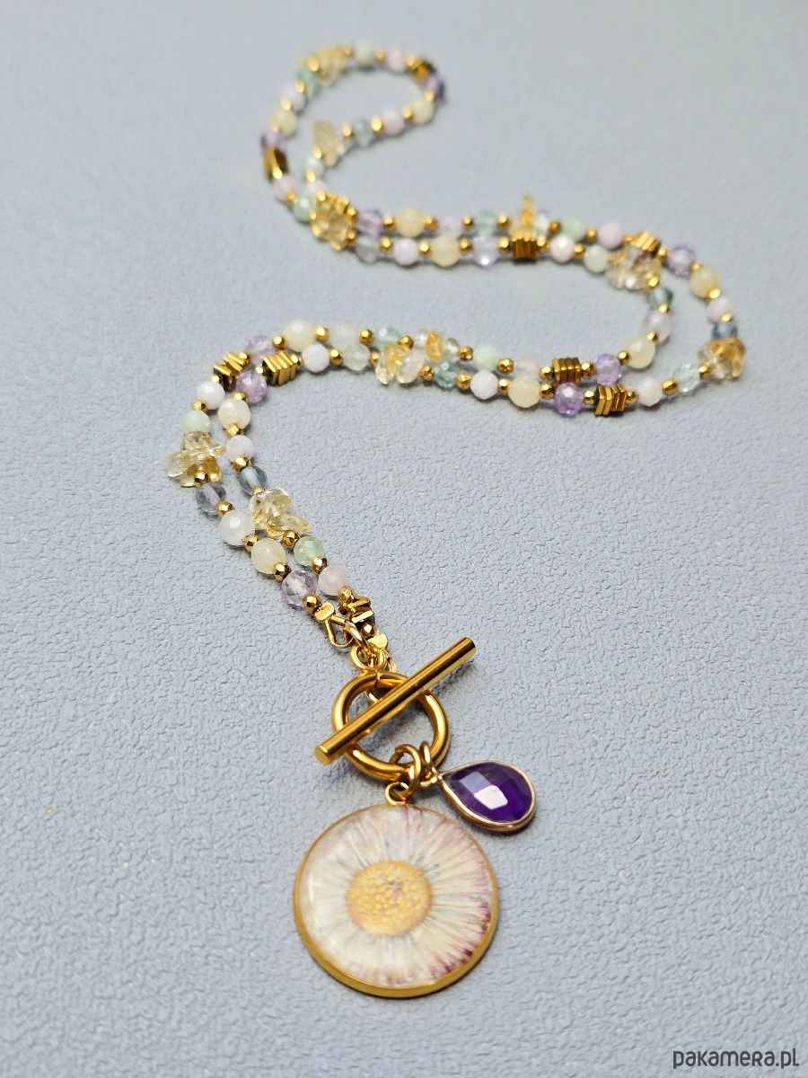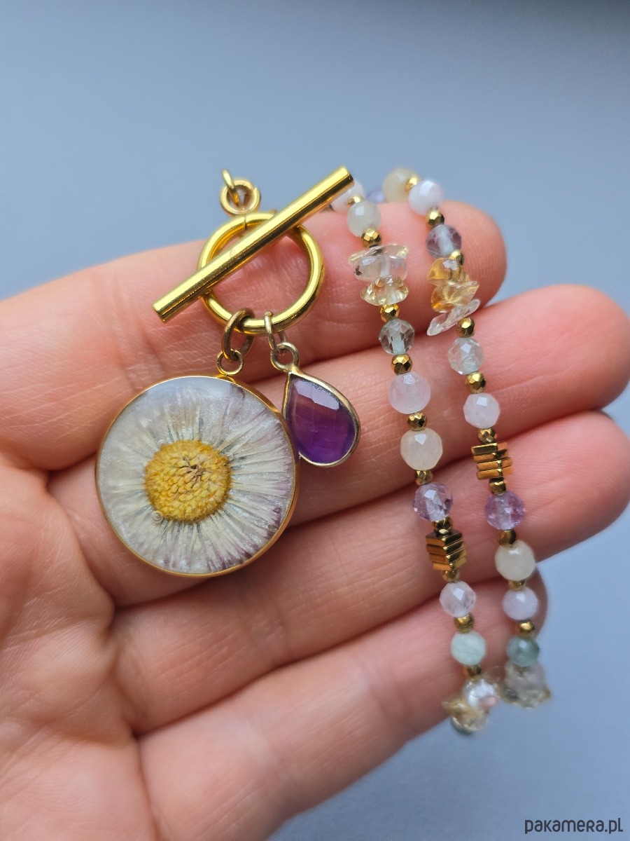 Ozdobą naszyjnika jest okrągła zawieszką z zatopioną w żywicy stokrotką.