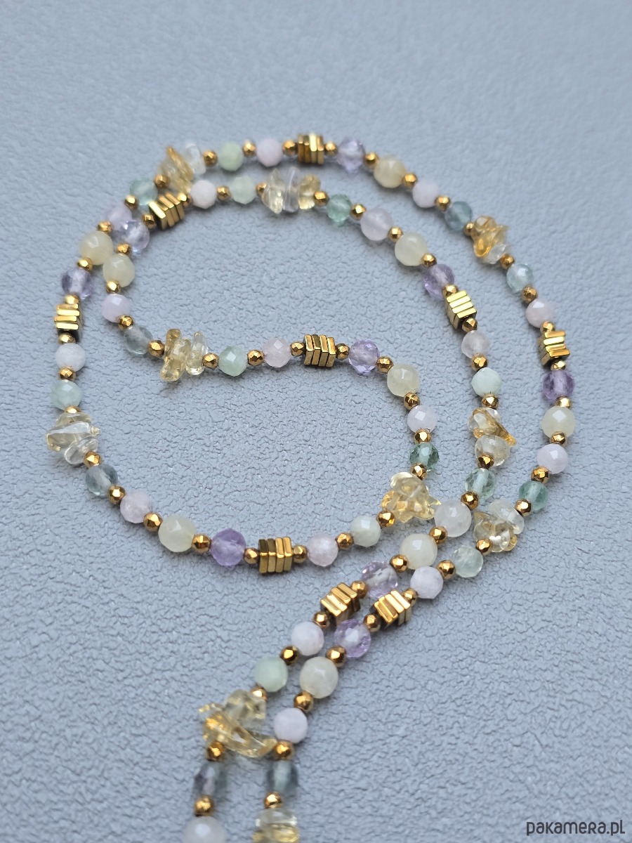 Wykorzystane kamienie: cytryn, ametyst, fluoryt, morganit, jadeit, złocony hematyt.
