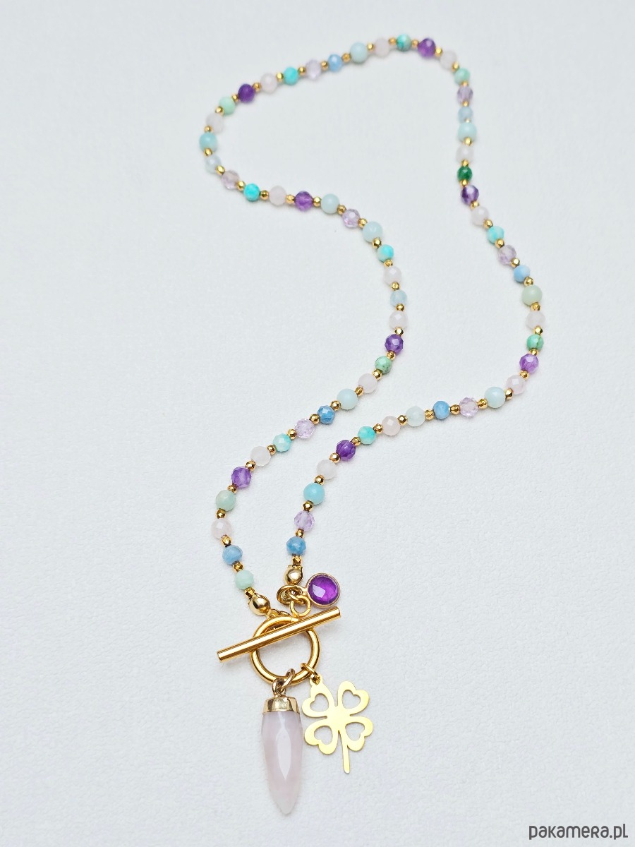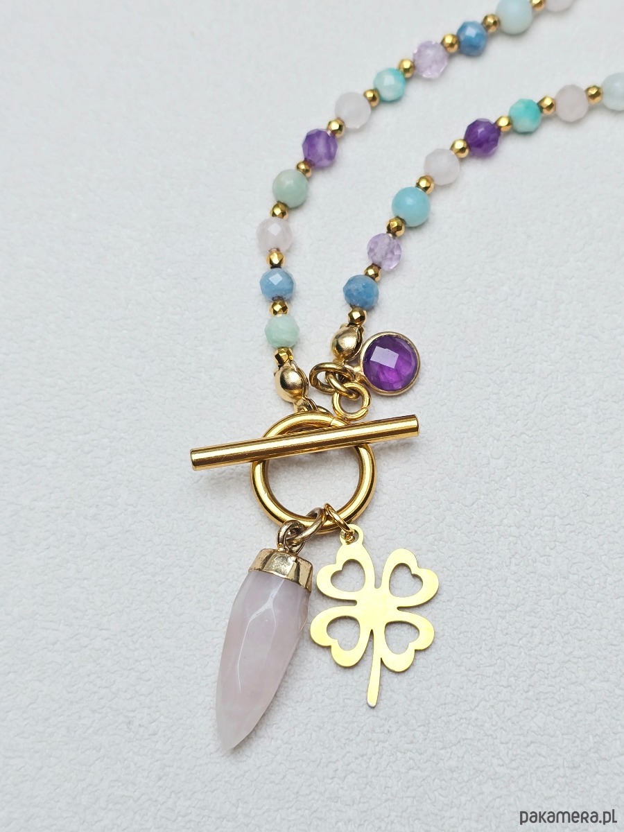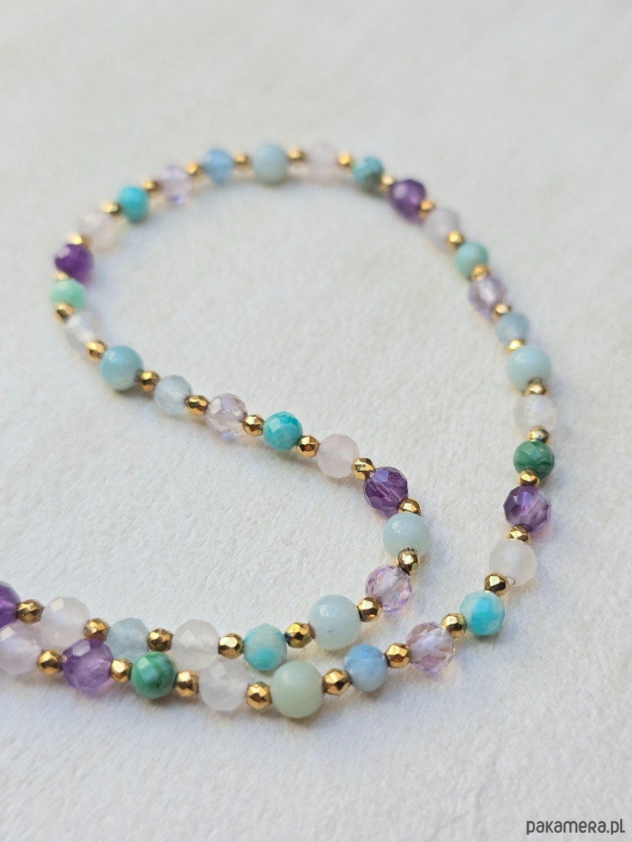 Wykorzystane kamienie: kwarc różowy, akwamaryn, ametyst, fluoryt, amazonit, złocony hematyt.