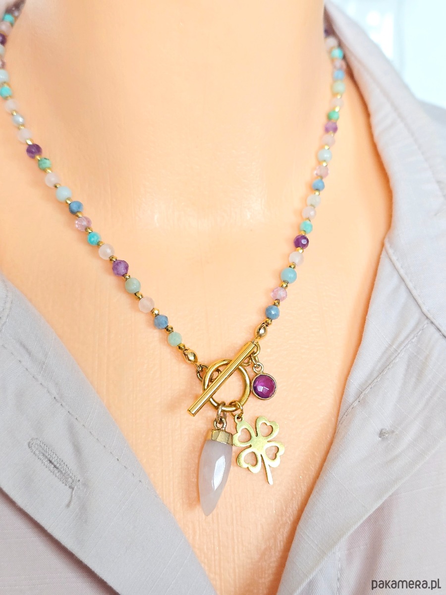 Delikatny, pastelowy naszyjnik z kamieni naturalnych o średnicy ok 4mm. Wykończony w stali szlachetnej złoconej z elementami srebra złoconego