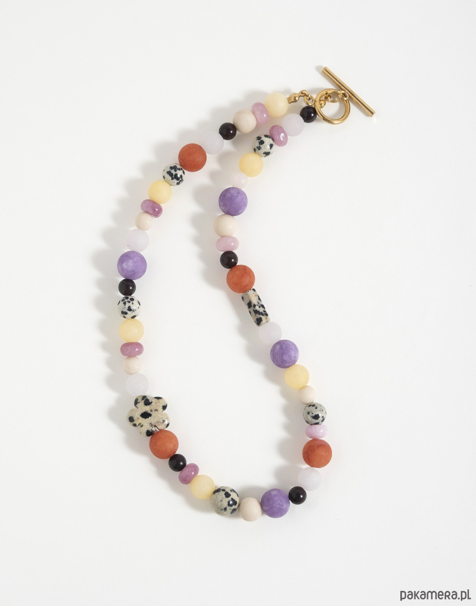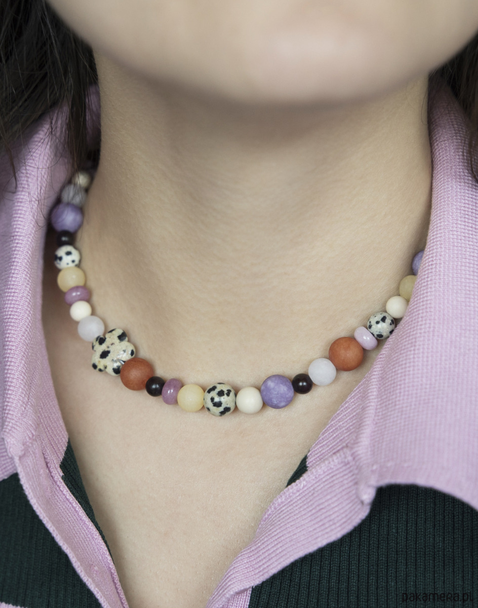 Kolorowy naszyjnik wykonano z naturalnych kamieni w różnych wielkościach: jaspisu dalmatyńskiego, agatu, jadeitu, kamienia rzecznego.