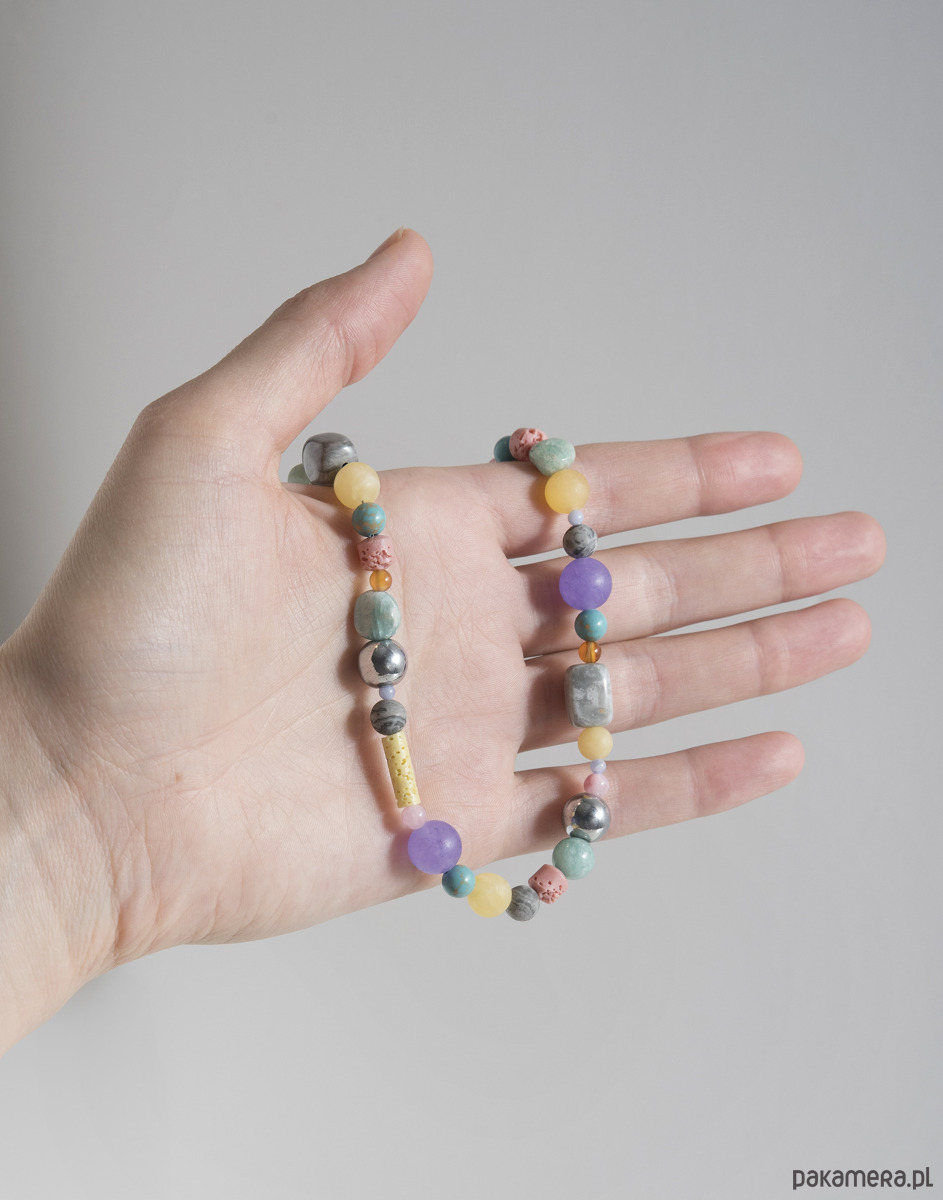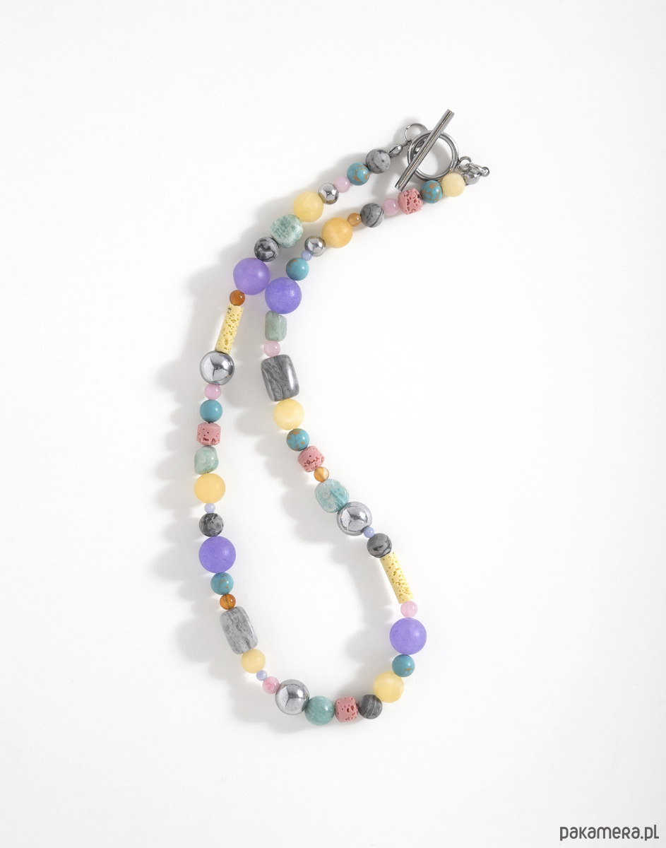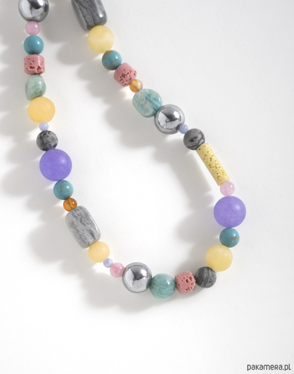 Naszyjnik wykonany z naturalnych kamieni o różnych wielkościach, tworzących barwną, wyrazistą kompozycję. Kolorystyka obejmuje odcienie żółte, fioletowe, szare i turkusowe. Wykorzystane kamienie to lawa wulkaniczna, hematyt, jadeit, jaspis, agat i magnezyt. To model, który przyciąga uwagę i ożywia stylizacje.