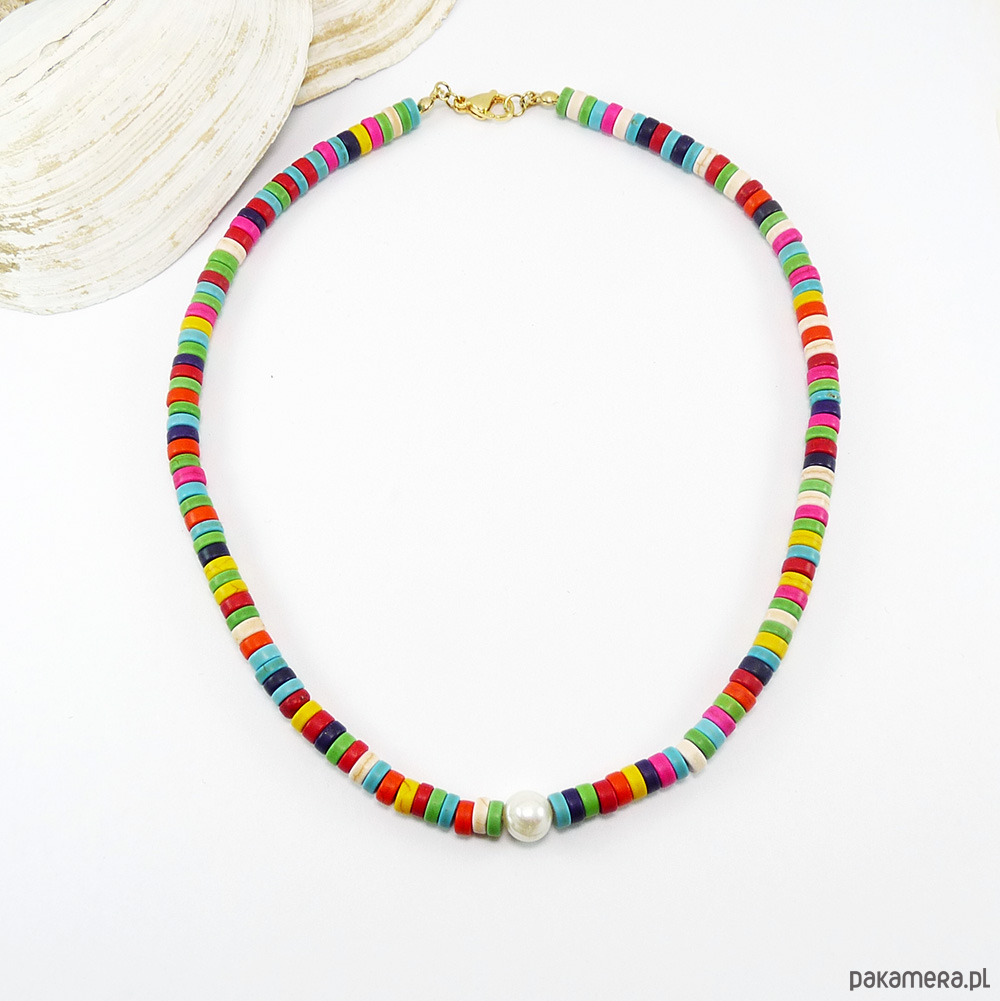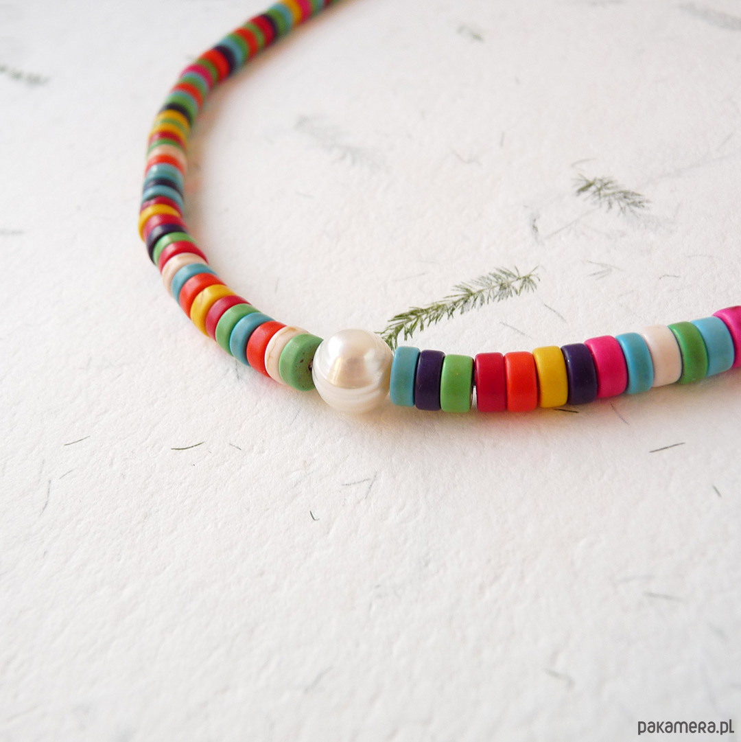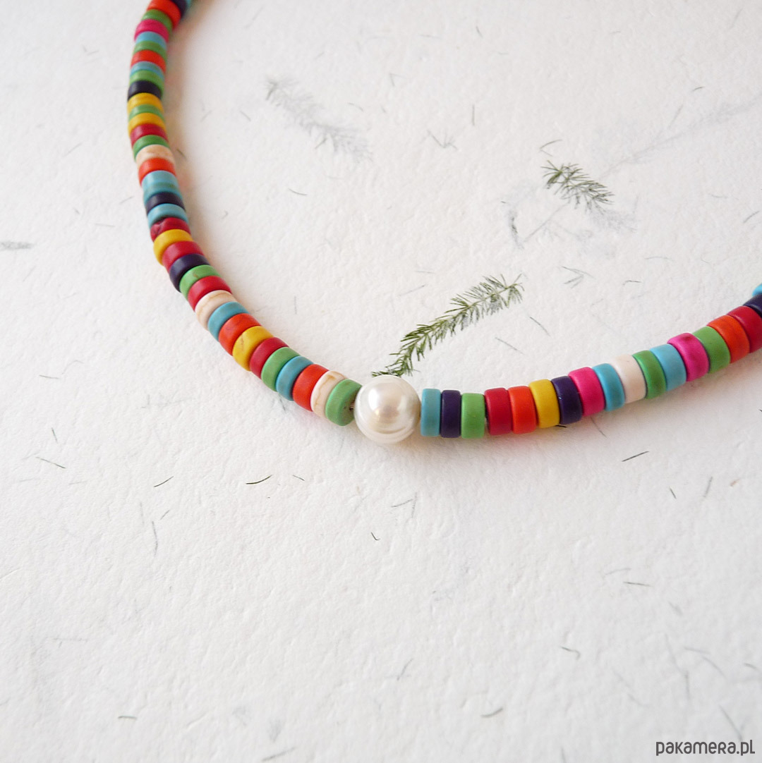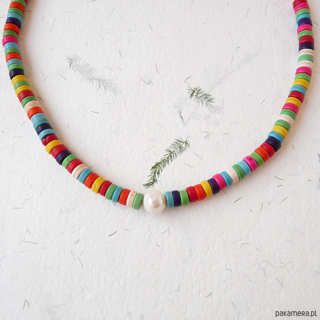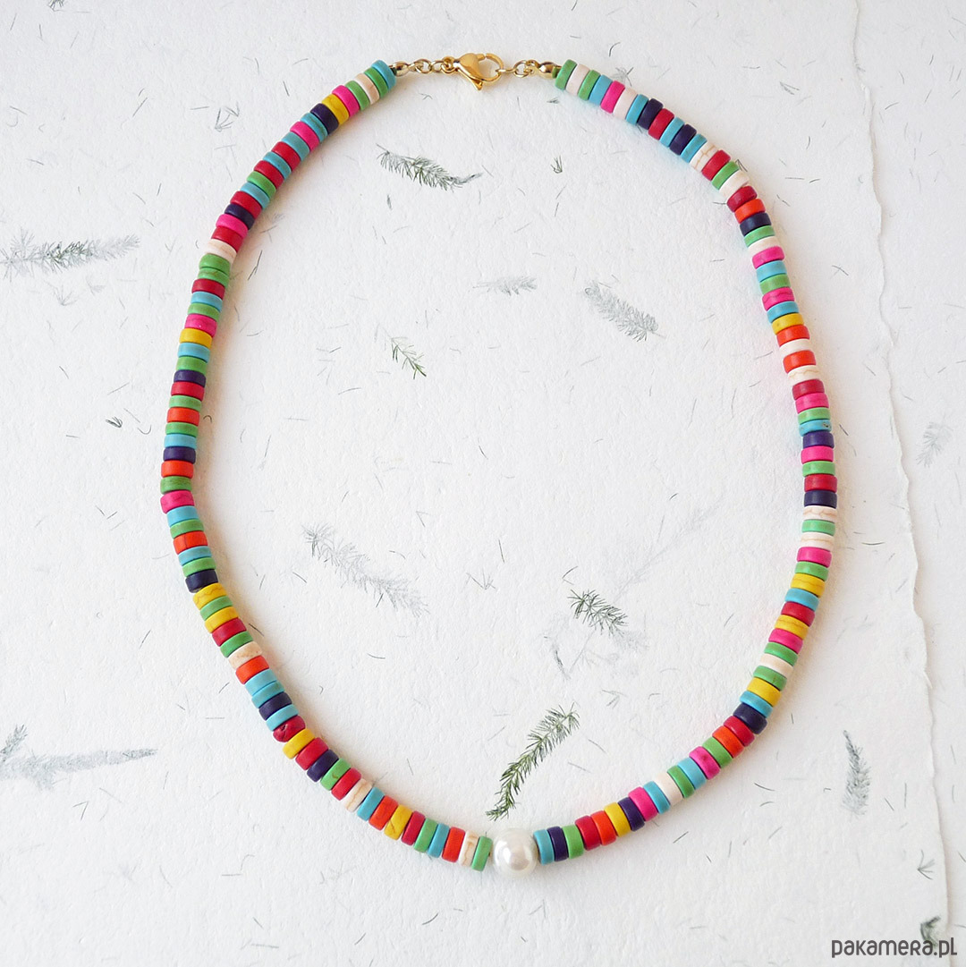 Kolorowy, modny naszyjnik z perełką i talarkami howlitu