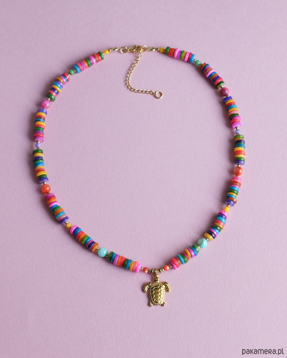 Kolorowy naszyjnik choker z barwionej MASY PERŁOWEJ (muszli) i złotego HEMATYTU, z zawieszką w kształcie żółwika. Zawieszka, zapięcie i łańcuszek to STAL SZLACHETNA w kolorze złotym.