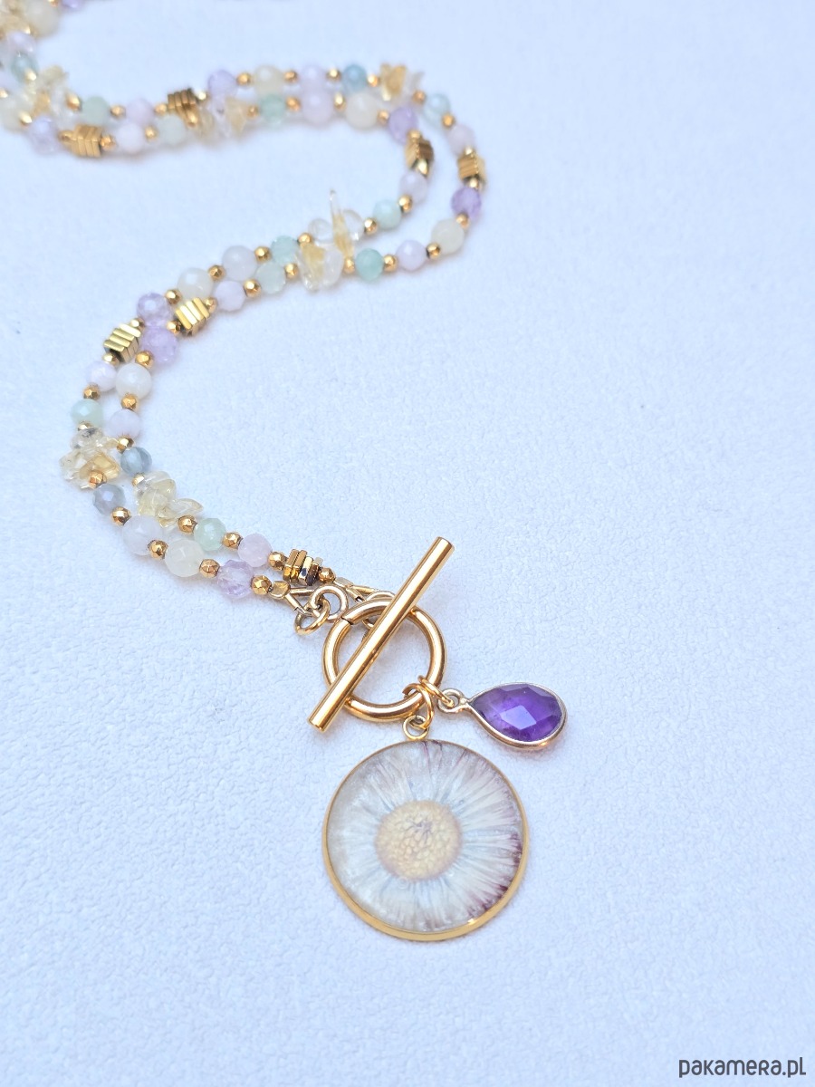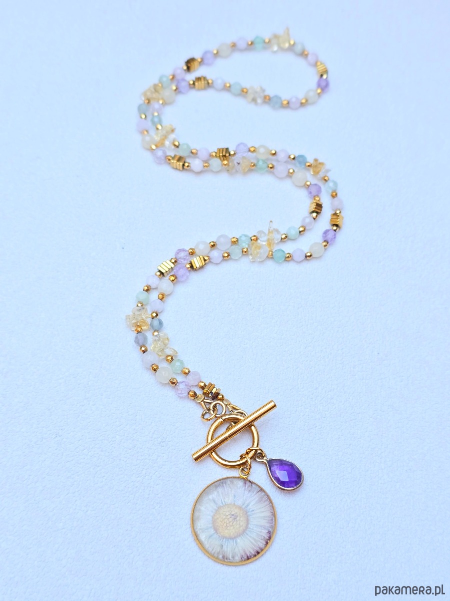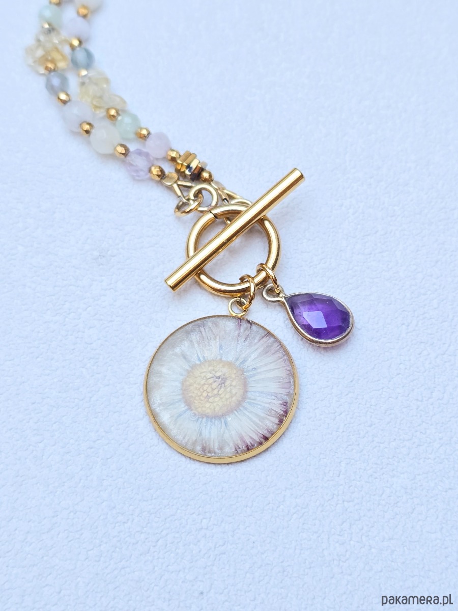 Ozdobą naszyjnika jest okrągła zawieszką z zatopioną w żywicy stokrotką.