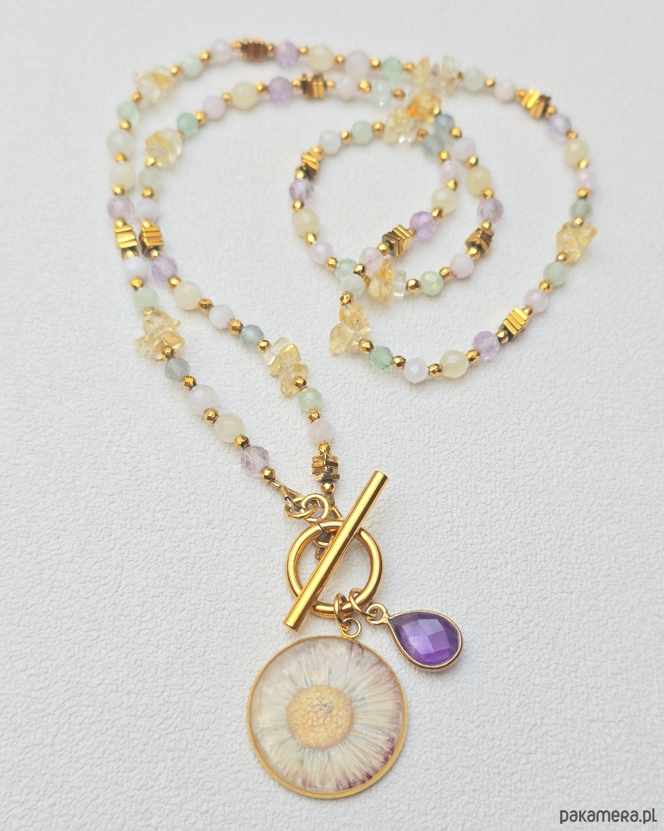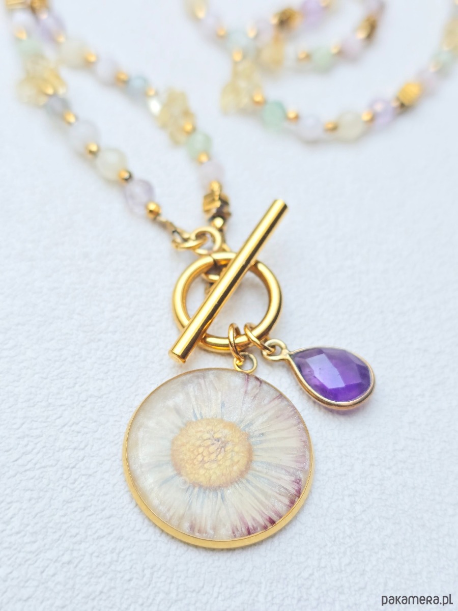 Ozdobą naszyjnika jest okrągła zawieszką z zatopioną w żywicy stokrotką.