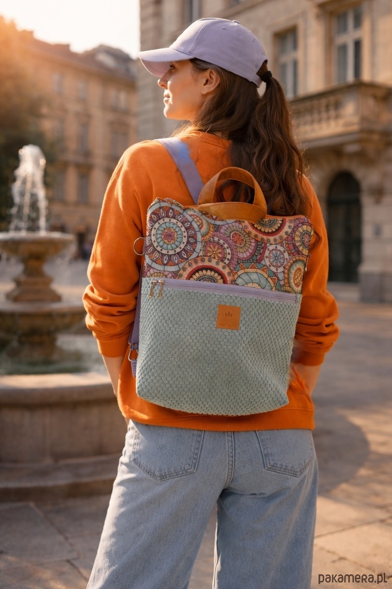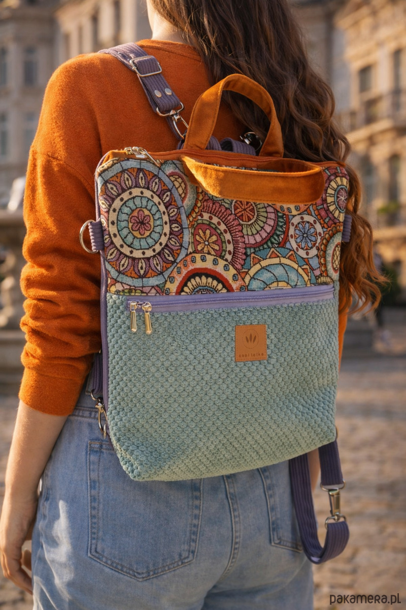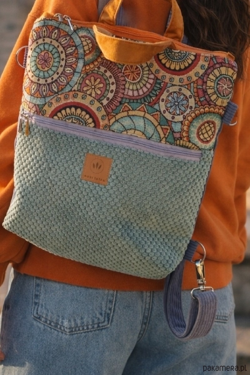 ❤ Materiał wierzchni: fioletowy sztruks, miętowy welur w kuleczki i żakard w mandale - mocne tkaniny odporne na przetarcia, miłe w dotyku, łatwe w pielęgnacji - plecak można delikatnie wyprać w temp. 30st. Niewielkie zabrudzenia można usunąć za pomocą piany z wody i mydła. Nie prasować.