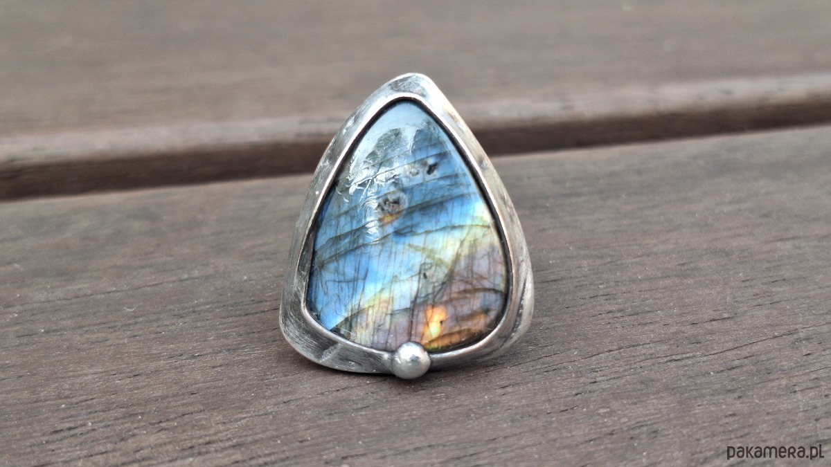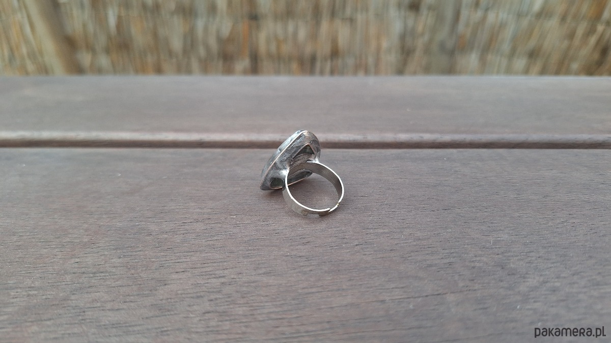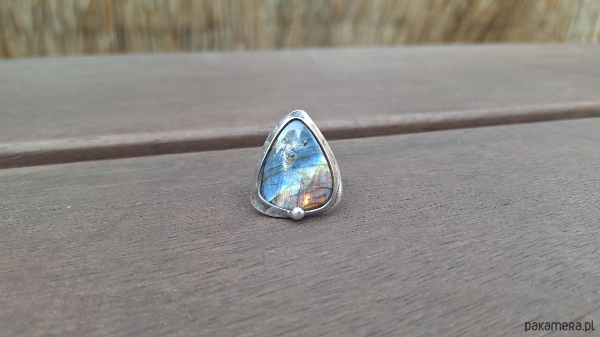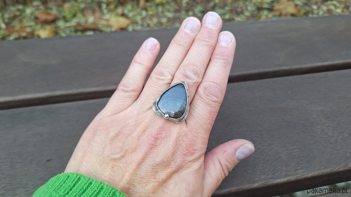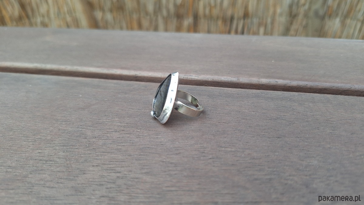 Pierścionek wykonany z miedzi, cyny i labradorytu. Wymiary ok. 2.5 na 2 cm. Regulowany. Nie jest ciężki.