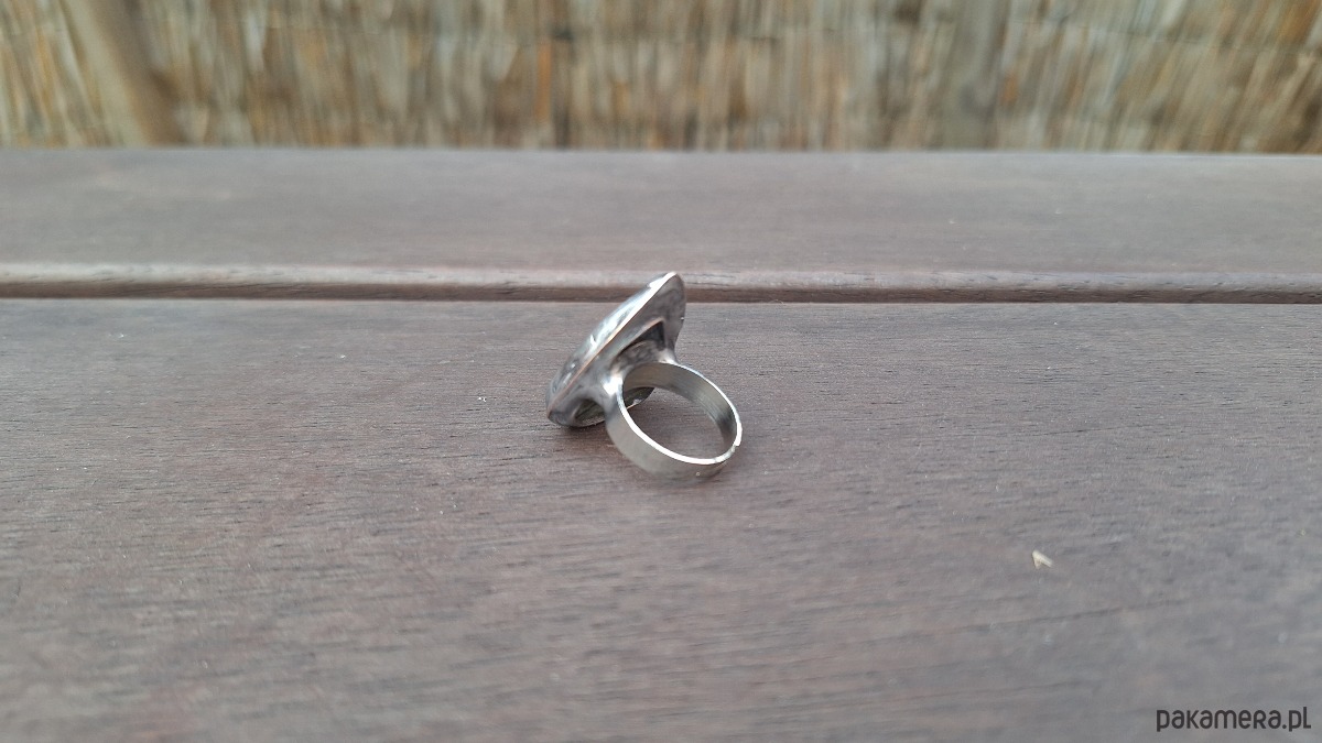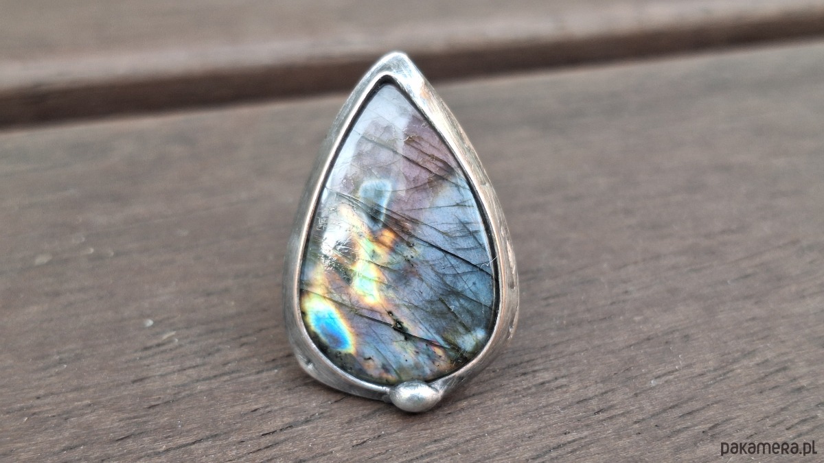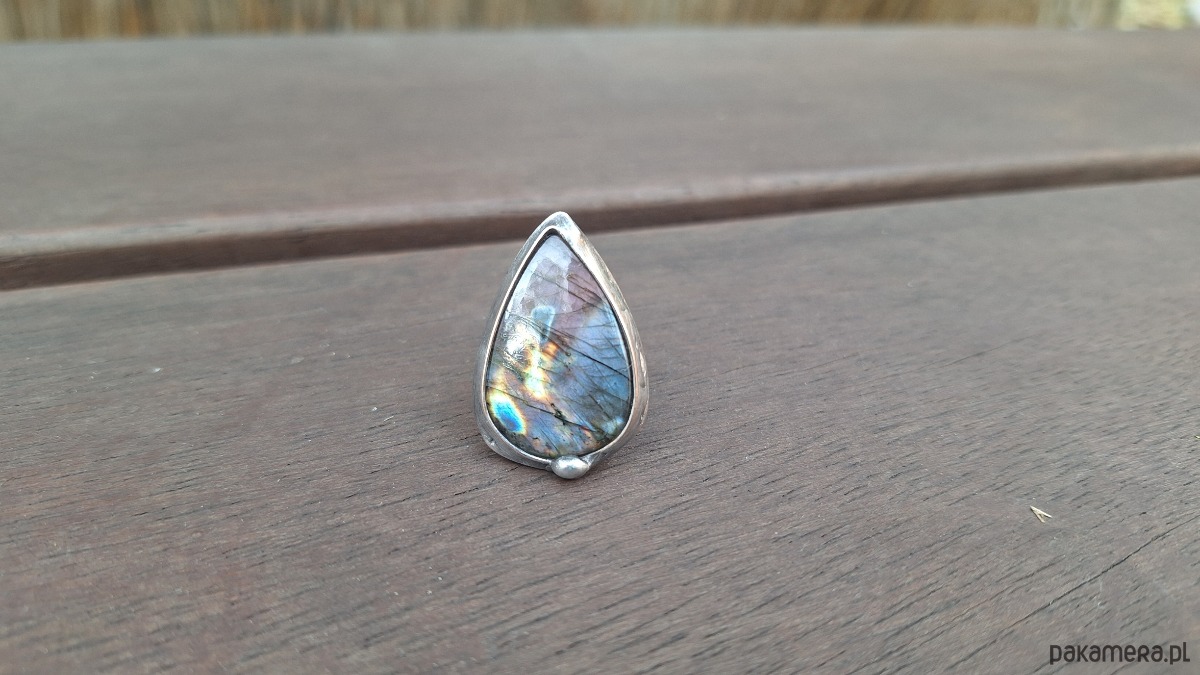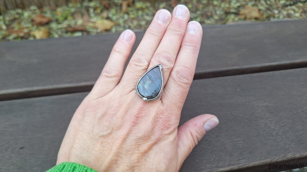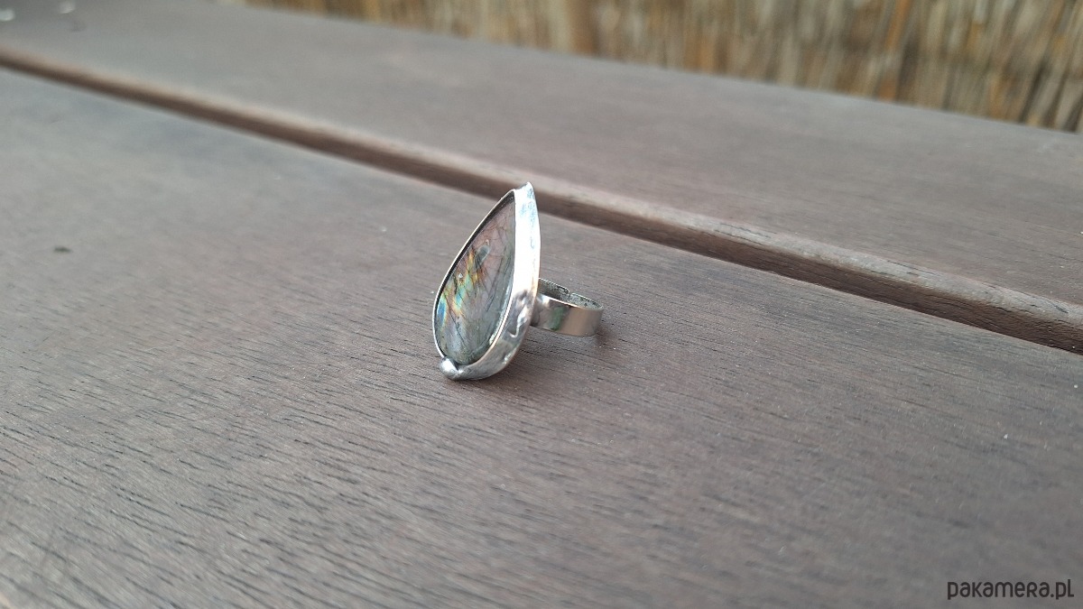 Pierścionek wykonany z miedzi, cyny i labradorytu. Wymiary ok. 2.8 na 2 cm. Regulowany. Nie jest ciężki.