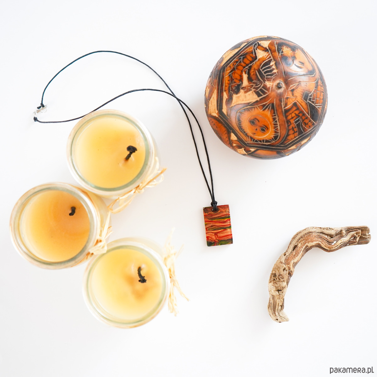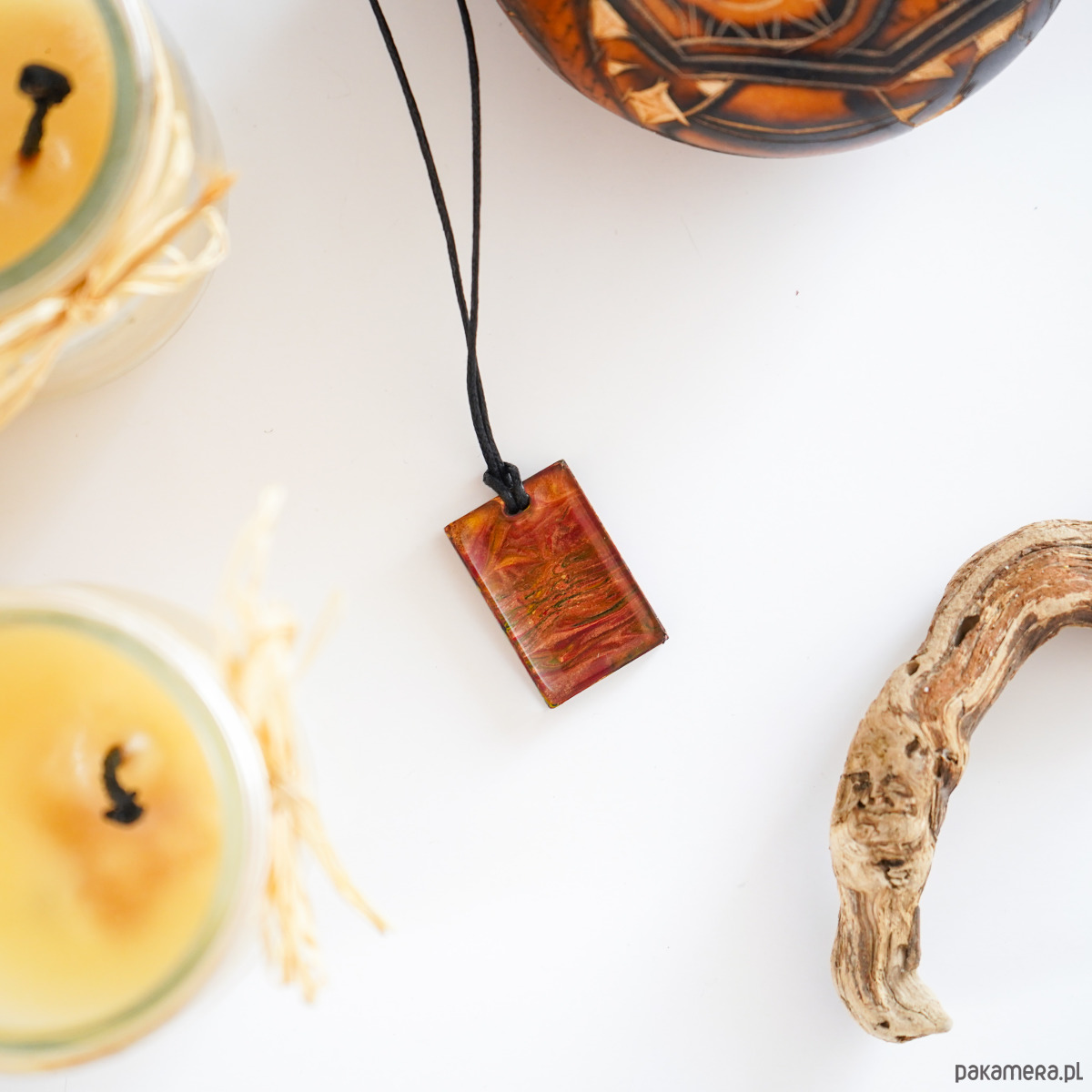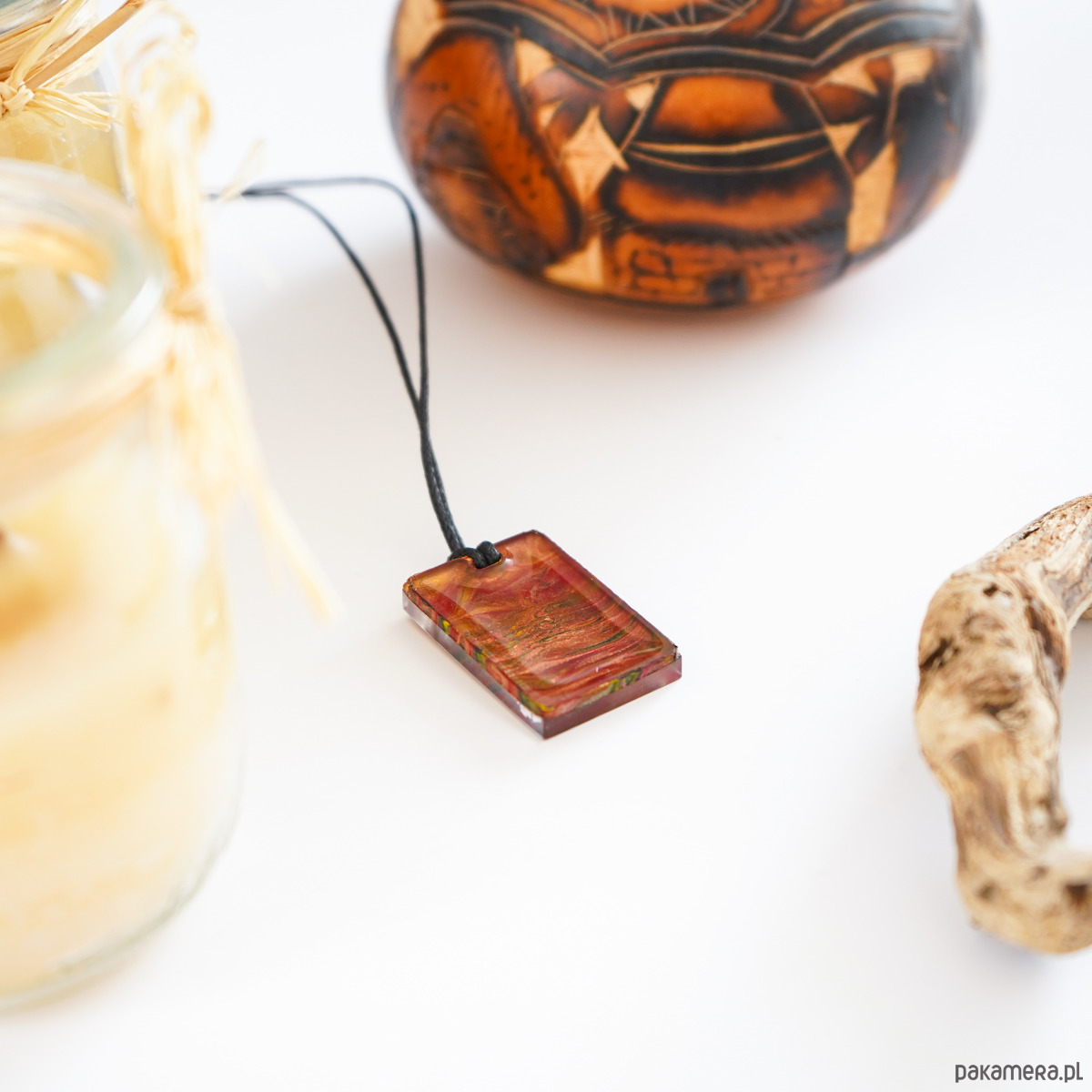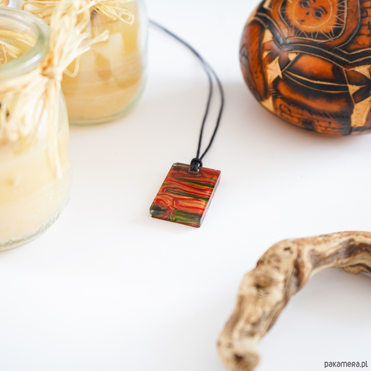 Kolorowy, prostokątny wisiorek z żywicy epoksydowej, na brązowym sznurku z zapięciem.