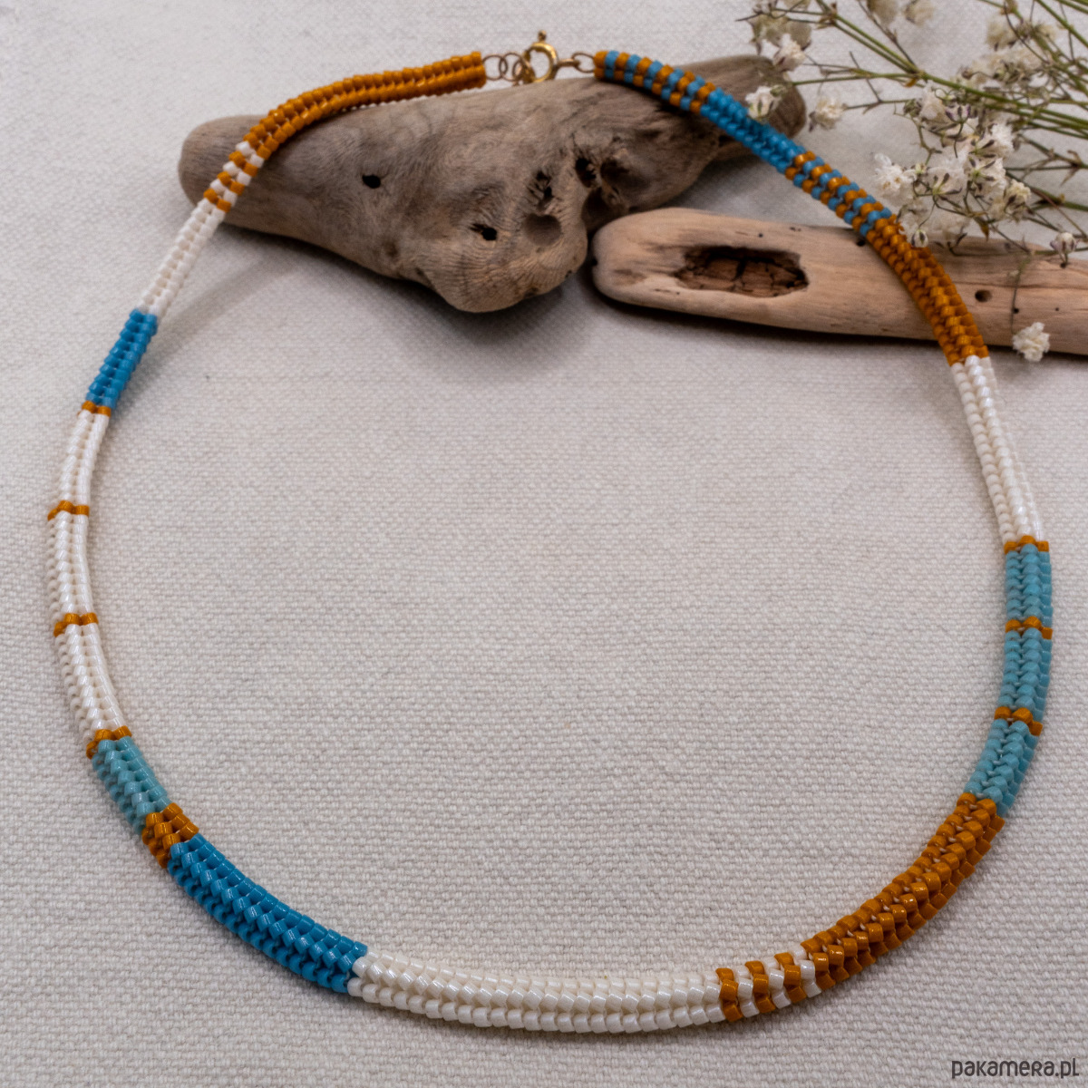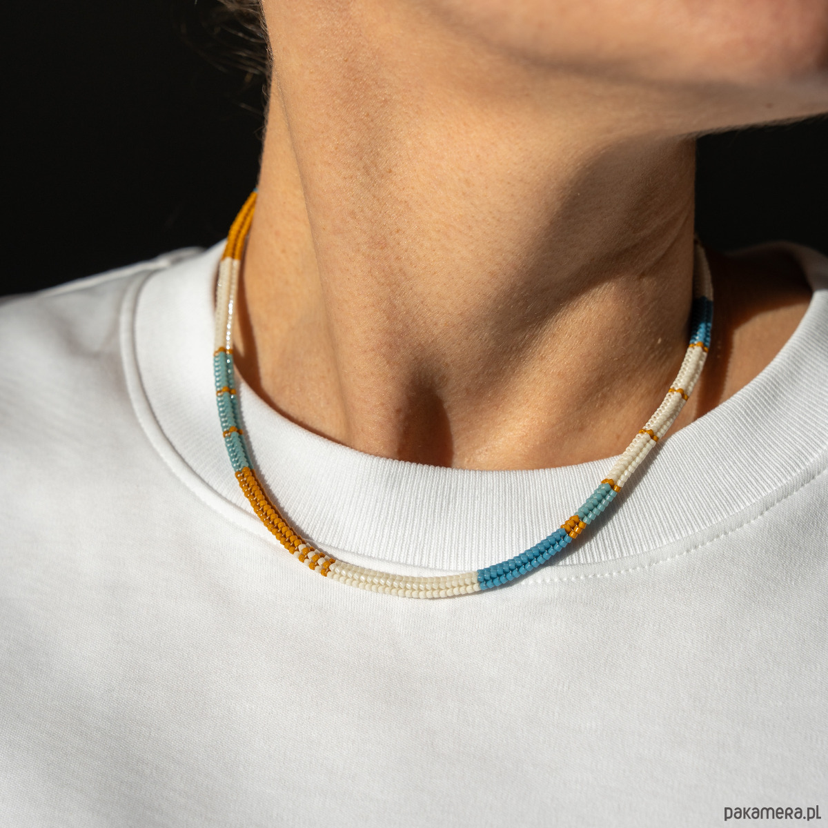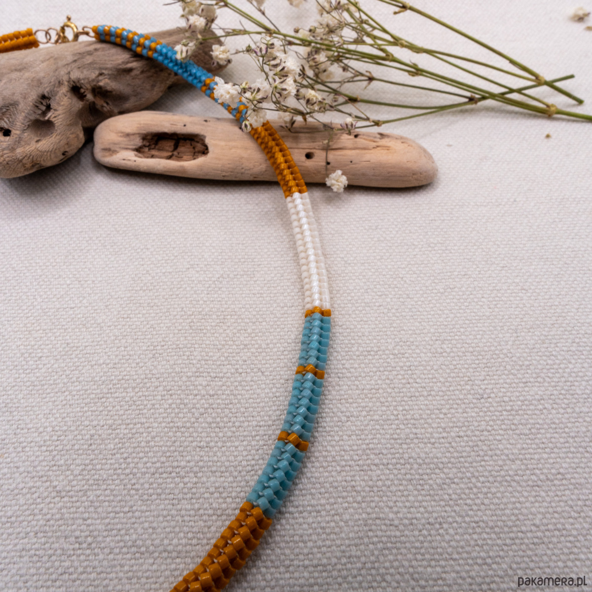W okolicach zapięć naszyjnik jest nieco sztywniejszy. To efekt kilkukrotnego przeciągnięcia nici, które zapewnia większą trwałość i stabilność konstrukcji. Koraliki Miyuki mają różne poziomy odporności, dlatego zaleca się unikanie długiego kontaktu z wodą (zwłaszcza słoną), a także z kosmetykami i perfumami. Aby naszyjnik zachował swój wygląd na długo, polecam przechowywać go w dołączonym woreczku przeciwkurzowym.