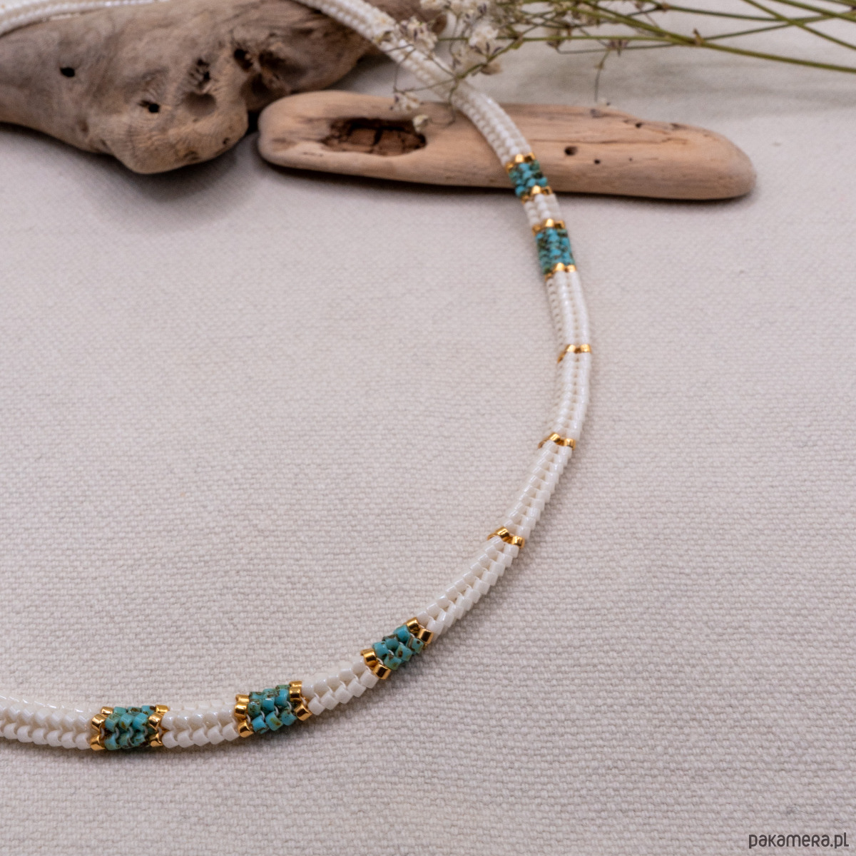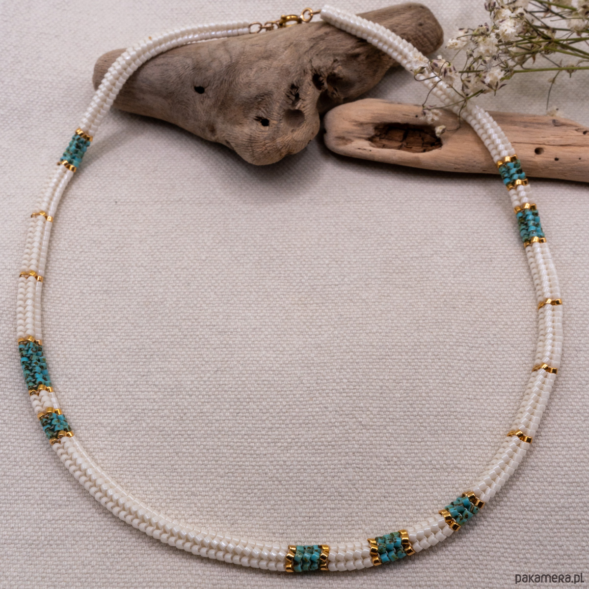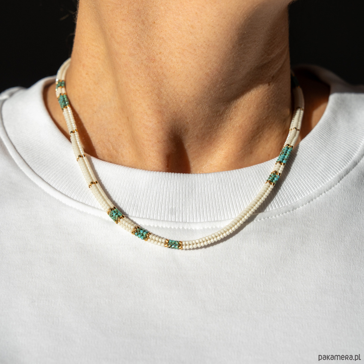 W okolicach zapięć naszyjnik jest nieco sztywniejszy. To efekt kilkukrotnego przeciągnięcia nici, które zapewnia większą trwałość i stabilność konstrukcji. Koraliki Miyuki mają różne poziomy odporności, dlatego zaleca się unikanie długiego kontaktu z wodą (zwłaszcza słoną), a także z kosmetykami i perfumami. Aby naszyjnik zachował swój wygląd na długo, polecam przechowywać go w dołączonym woreczku przeciwkurzowym.