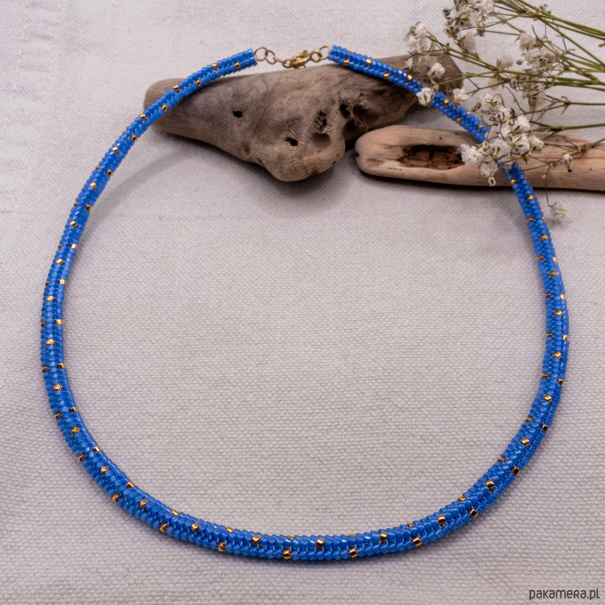 W okolicach zapięć naszyjnik jest nieco sztywniejszy. To efekt kilkukrotnego przeciągnięcia nici, które zapewnia większą trwałość i stabilność konstrukcji. Koraliki Miyuki mają różne poziomy odporności, dlatego zaleca się unikanie długiego kontaktu z wodą (zwłaszcza słoną), a także z kosmetykami i perfumami. Aby naszyjnik zachował swój wygląd na długo, polecam przechowywać go w dołączonym woreczku przeciwkurzowym.
