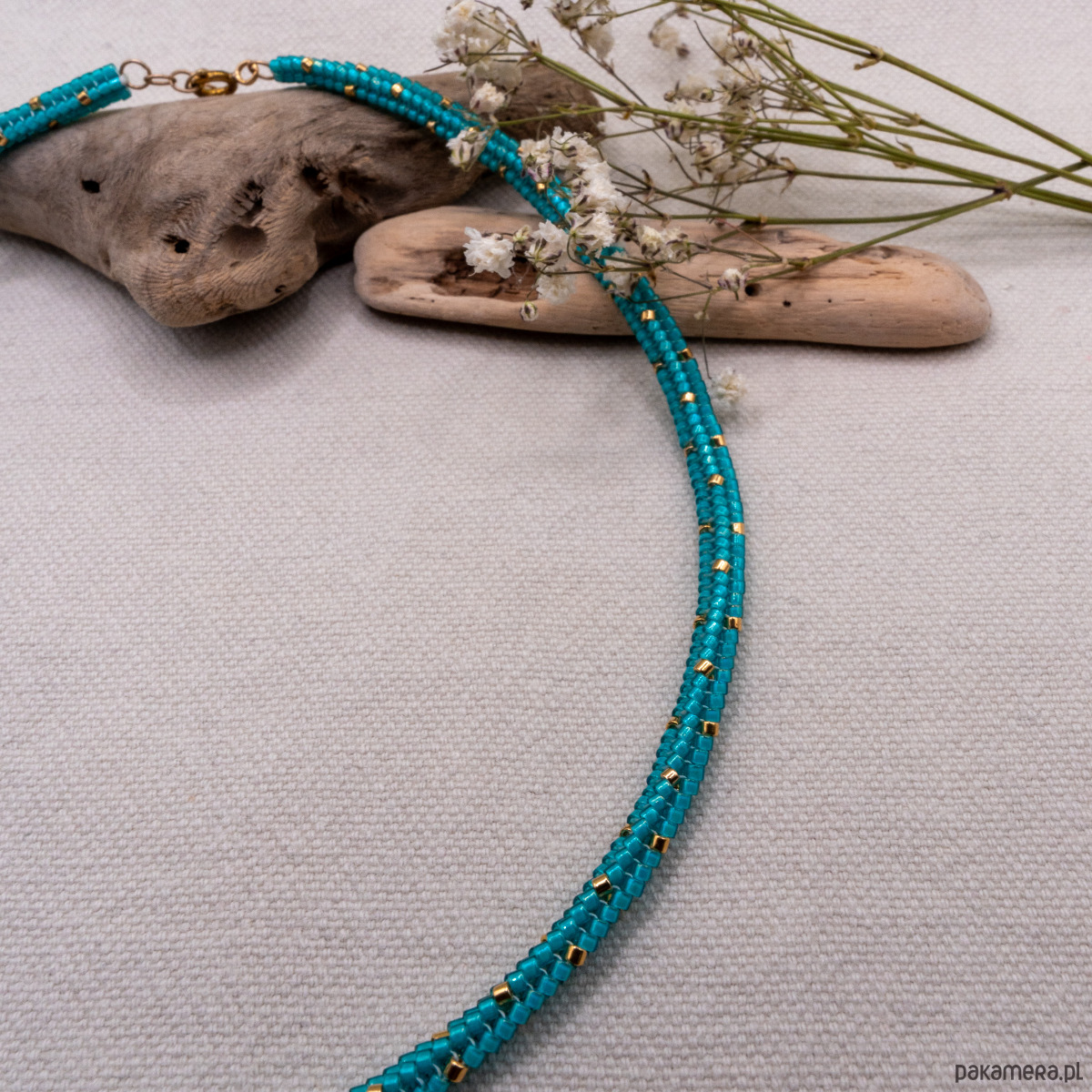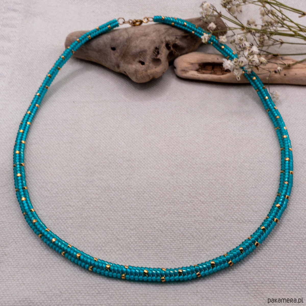 W okolicach zapięć naszyjnik jest nieco sztywniejszy. To efekt kilkukrotnego przeciągnięcia nici, które zapewnia większą trwałość i stabilność konstrukcji. Koraliki Miyuki mają różne poziomy odporności, dlatego zaleca się unikanie długiego kontaktu z wodą (zwłaszcza słoną), a także z kosmetykami i perfumami. Aby naszyjnik zachował swój wygląd na długo, polecam przechowywać go w dołączonym woreczku przeciwkurzowym.
