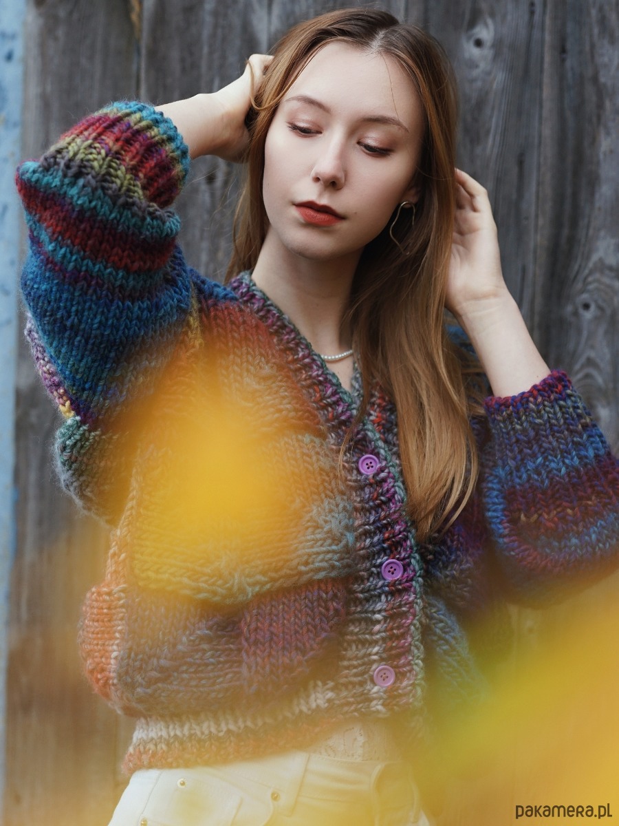 Autorski kardigan został zaprojektowany i wykonany z mieszanki wełny merino i akrylu ( 53%/47%)