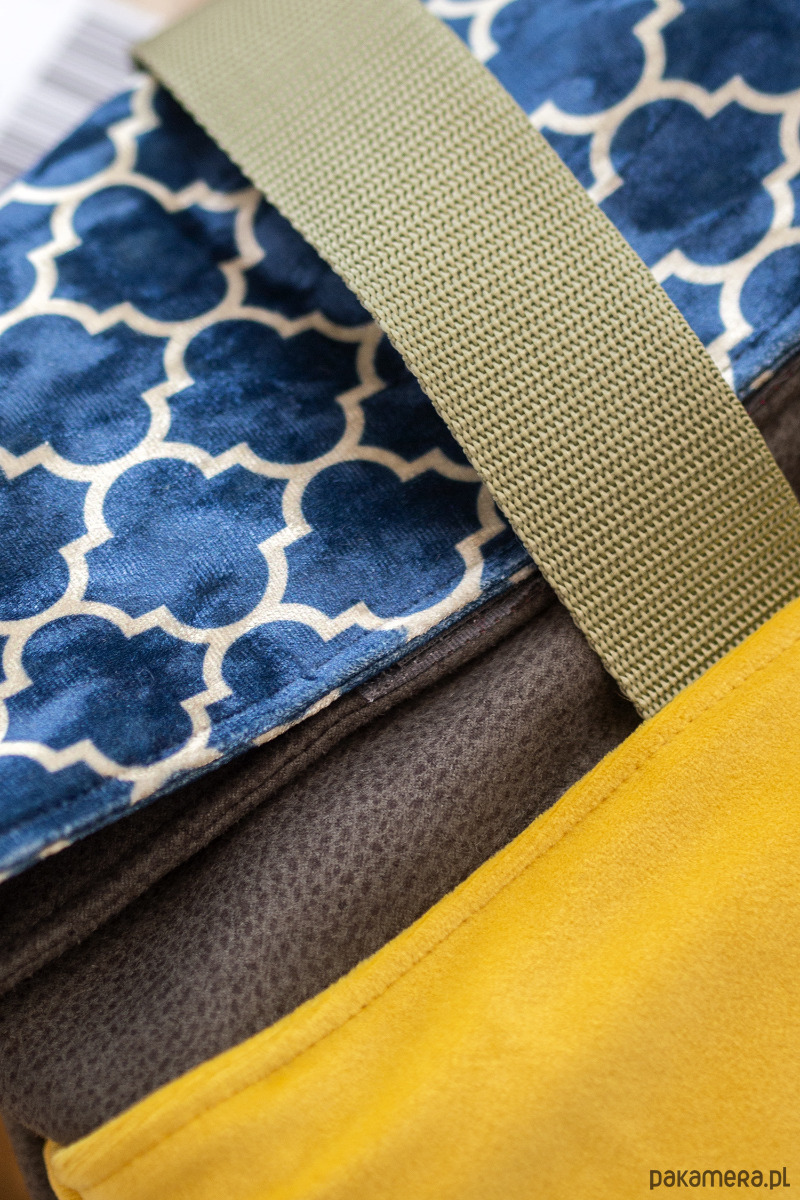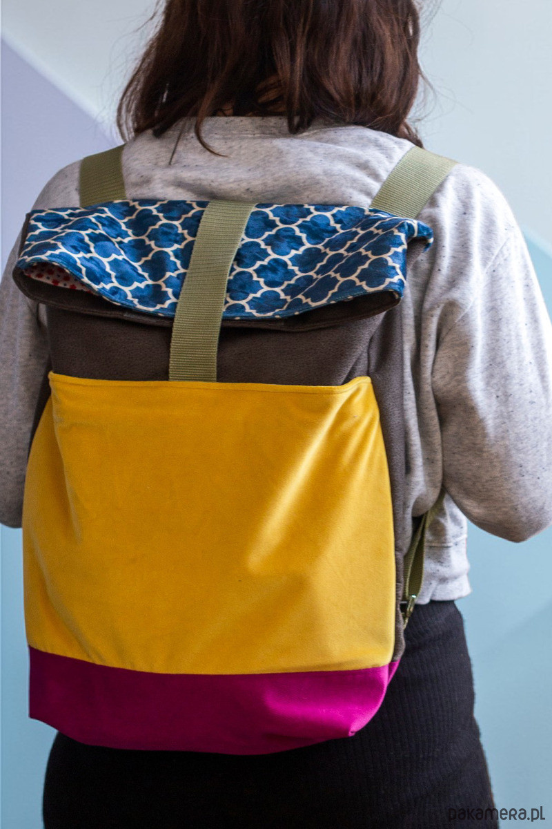 Duży, damski plecak miejski składany i zapinany na rzep wykonany z kilku rodzajów tkanin.