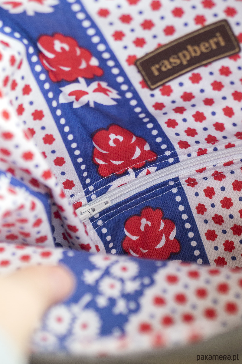 Regulowane paski. W środku bawełniana podszewka w kwiaty oraz mała kieszonka na suwak.
