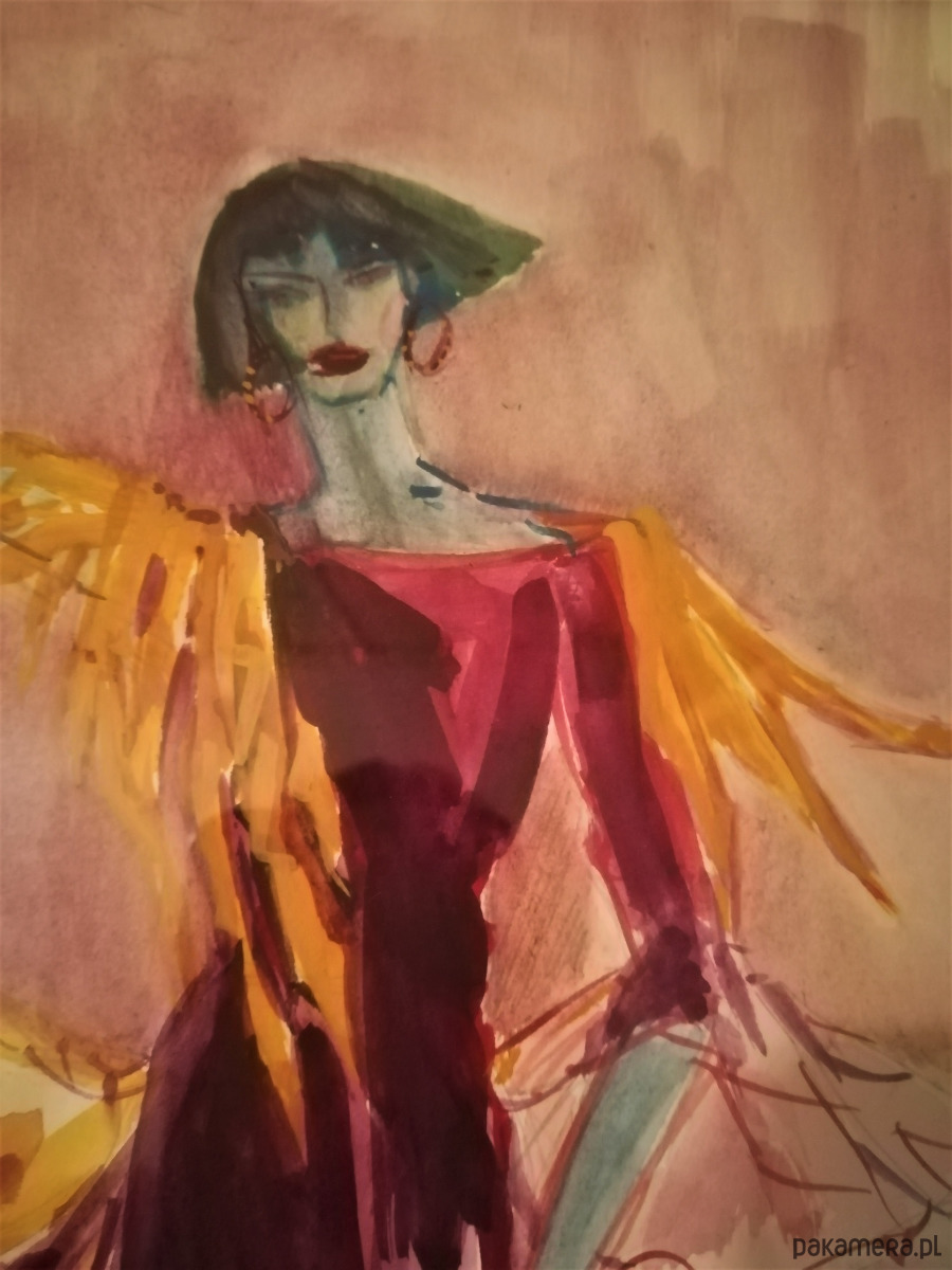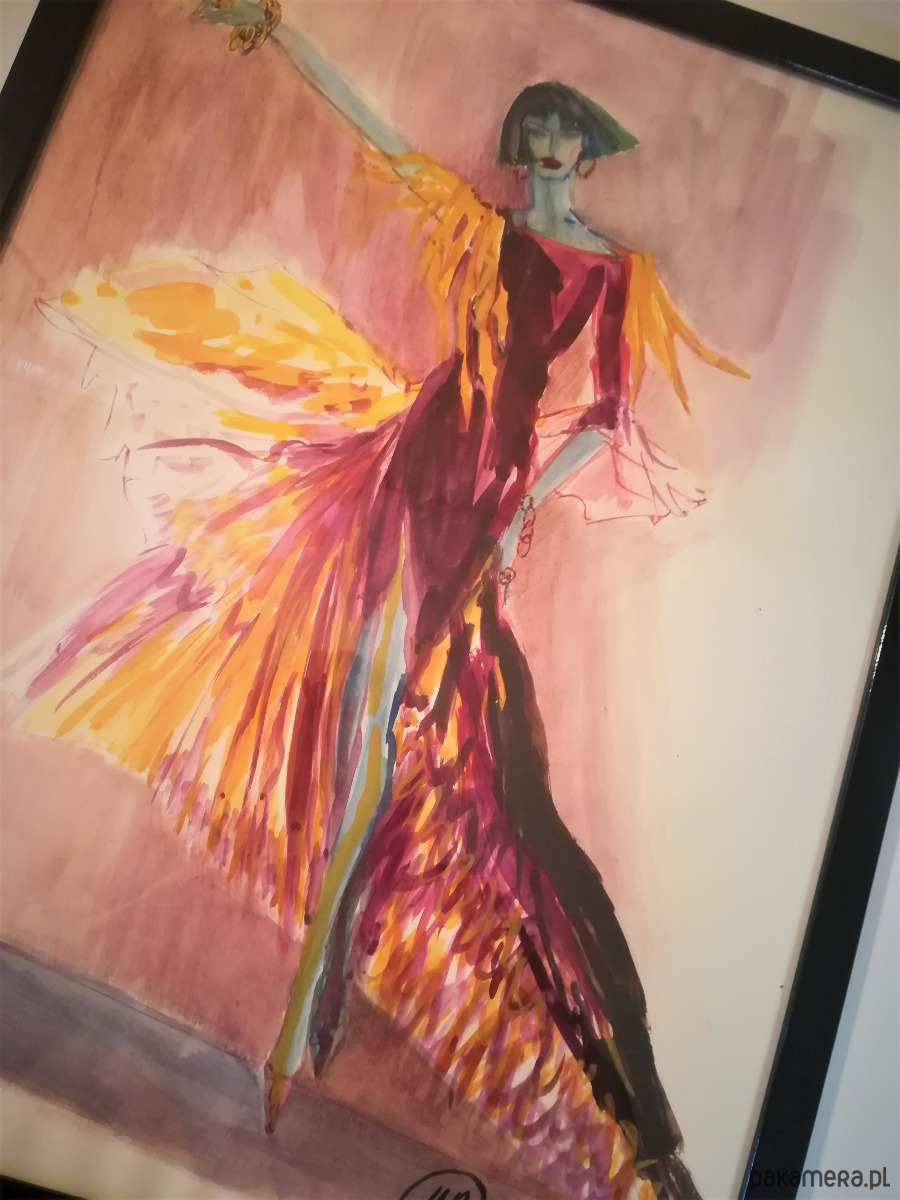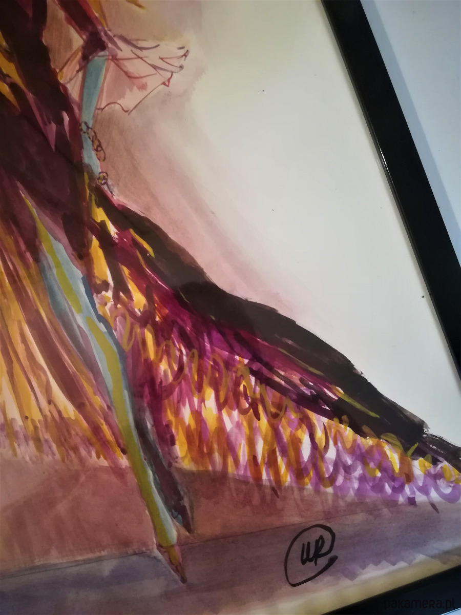 Szkic modelki w fioletowej sukni wykonany w technice akwareli i kolorowych tuszy. Format 30x40 cm.Wykonanie na papierze w niebieskim kolorze.Oprawiony w metalową,czarną ramkę, za szkłem.