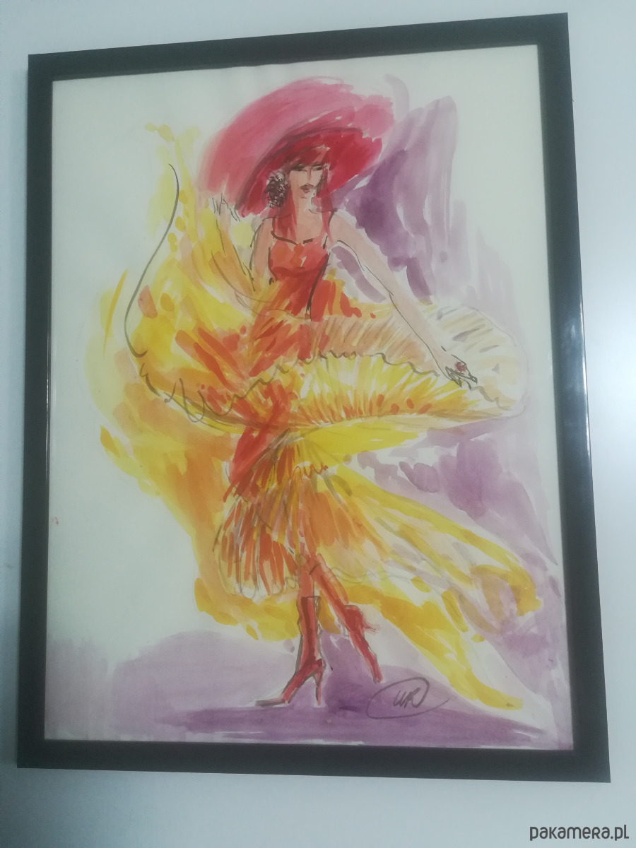 Szkic modelki w żółtej sukni wykonany w technice akwareli i kolorowych tuszy. Format 30x40 cm.Wykonanie na papierze w kremowym kolorze.Oprawiony w metalową,czarną ramkę, za szkłem.