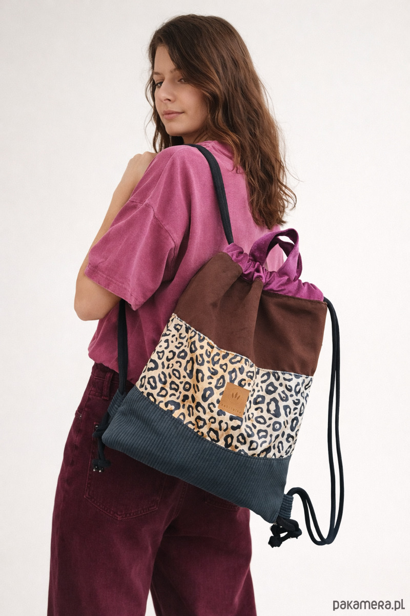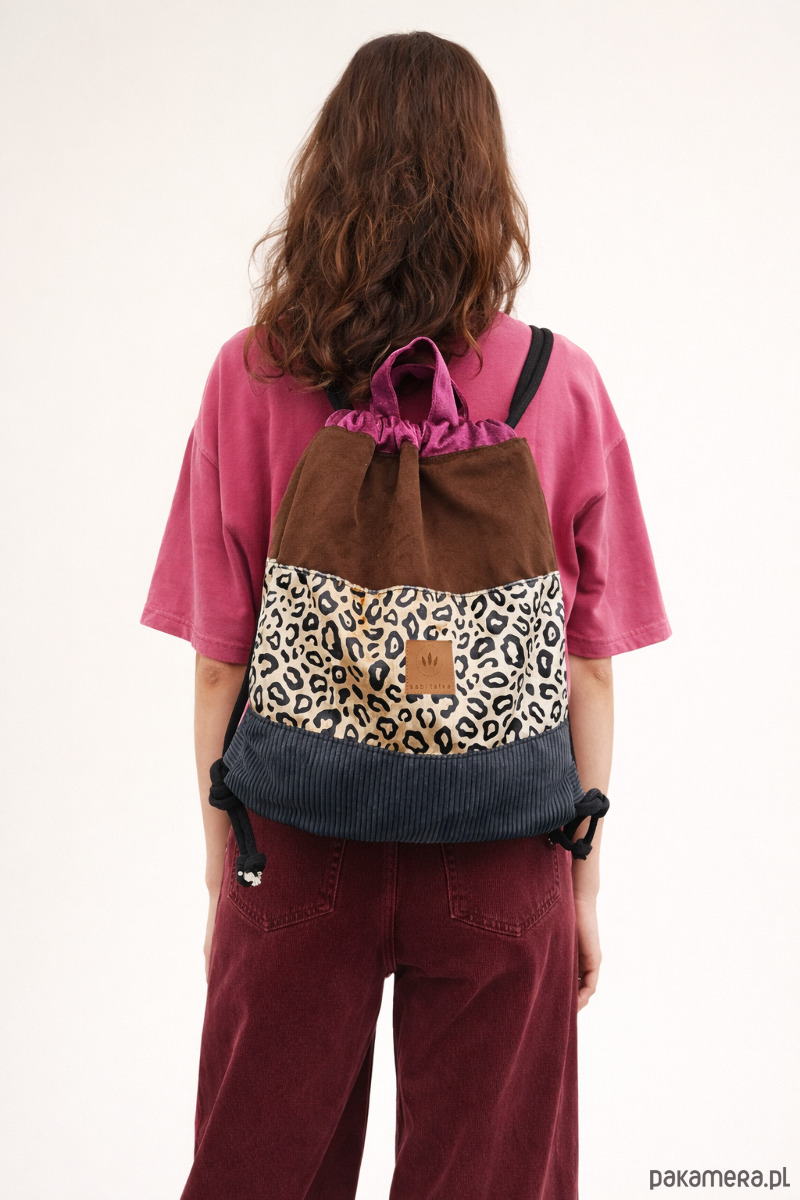 Kolorowy plecak worek z modnym motywem panterki, łączący różne faktury i odcienie.
