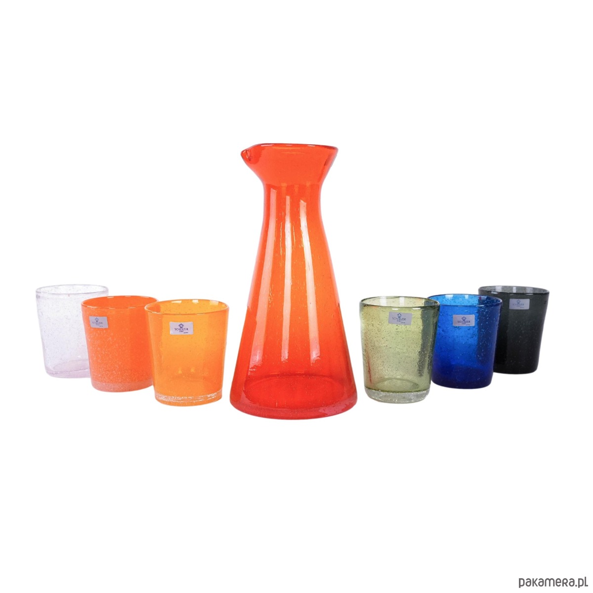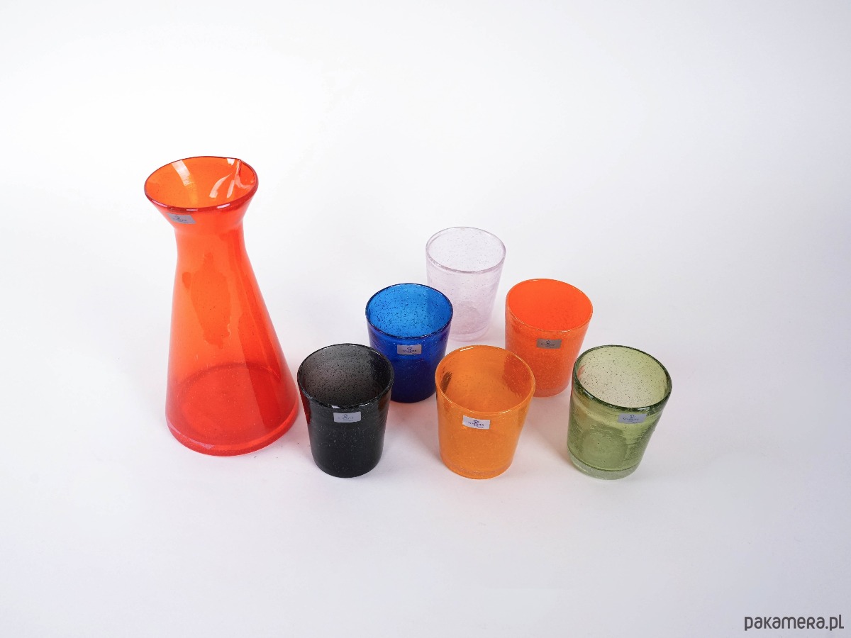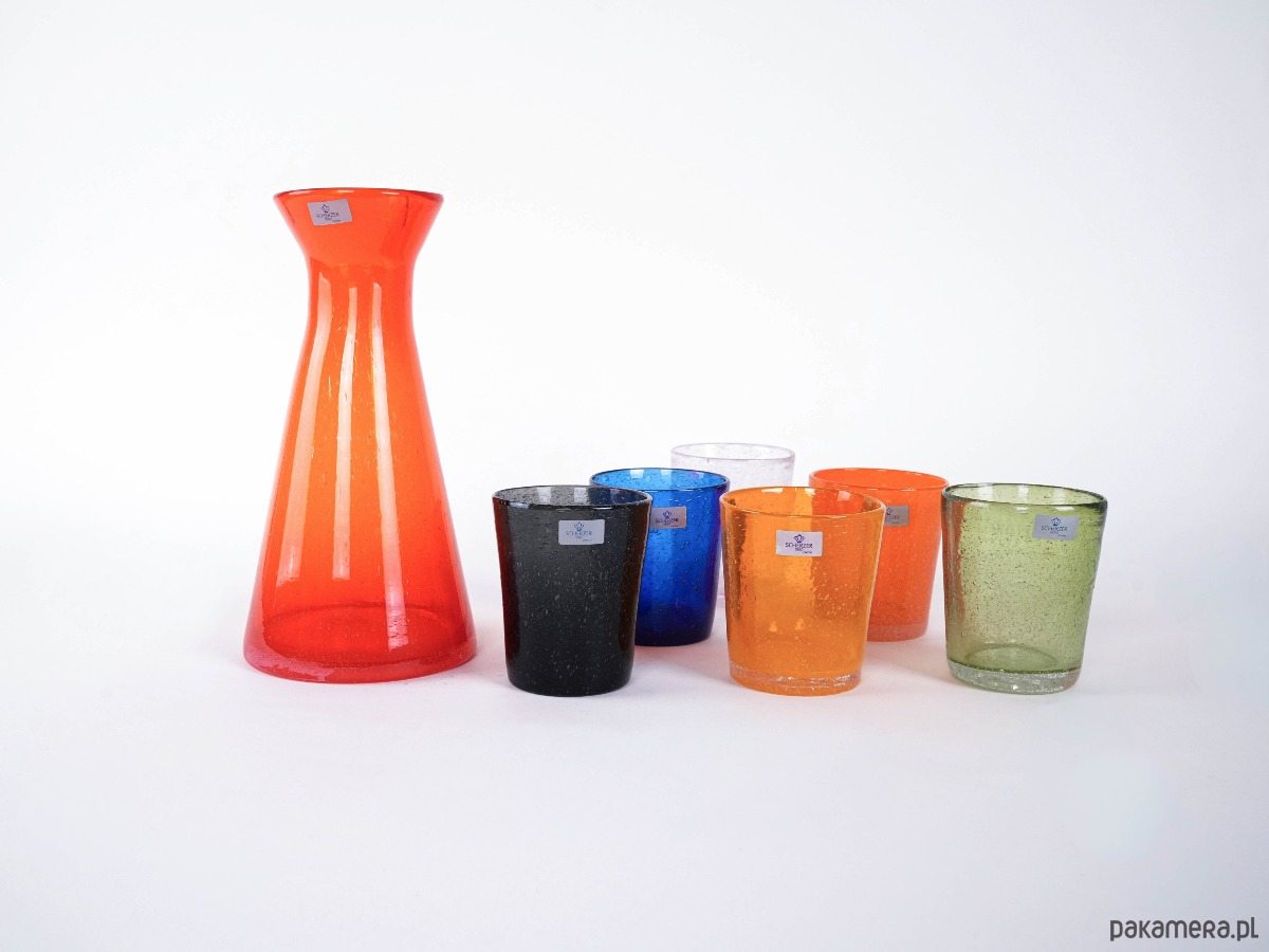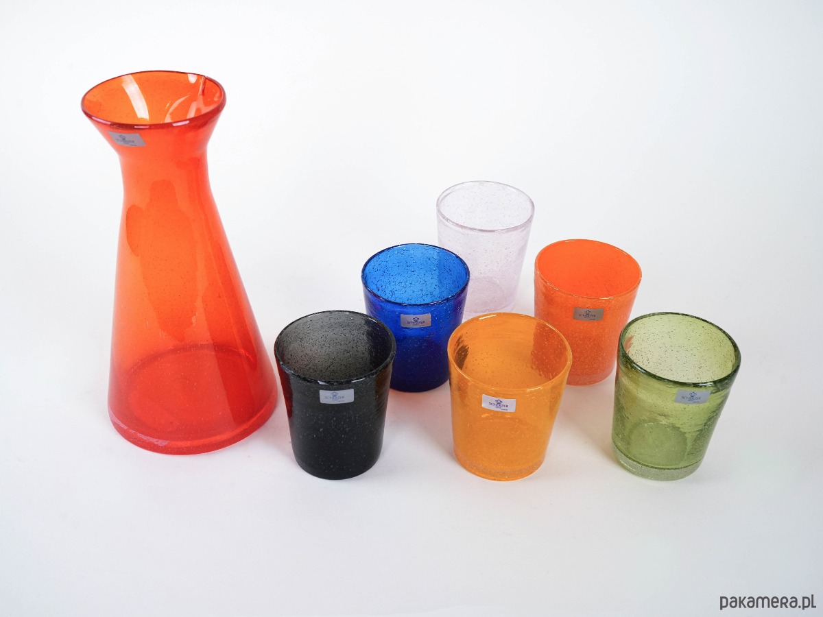 Zestaw z barwionego szkła bąbelkowego autorstwa Scherzer Bavaria, marki znanej z wysokiej jakości porcelany i szkła artystycznego od 1880 roku. Intensywne, nasycone kolory w stylistyce vintage nadają całości wyjątkowy, dekoracyjny charakter. Idealny element kolekcji lub oryginalny akcent na stole w duchu designu retro.