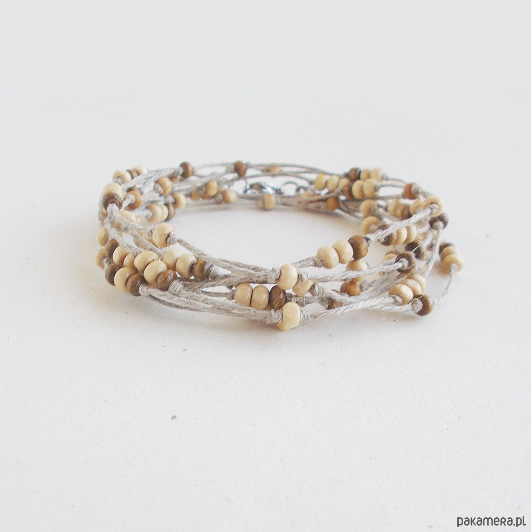 drewniane koraliki 3x4 mm, len naturalny, stal szlachetna (karabińczyk i łańcuszek)