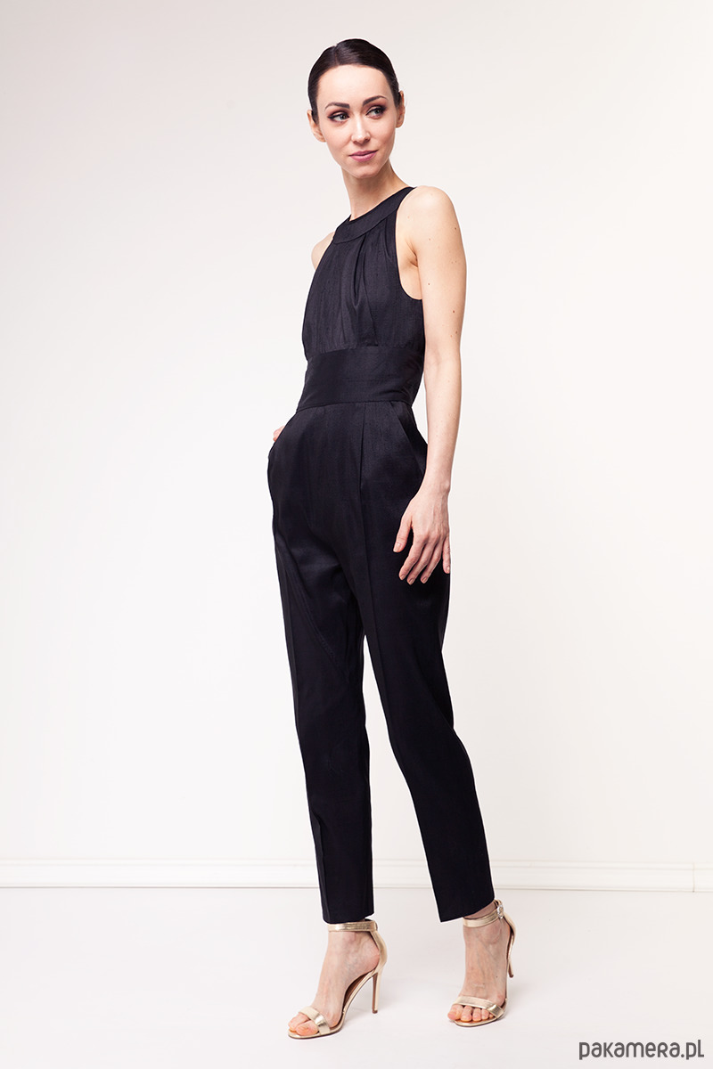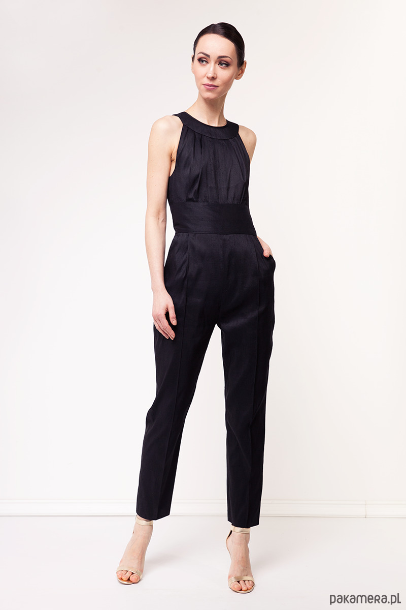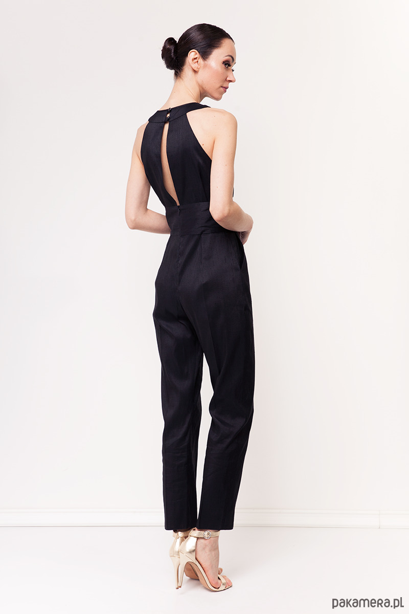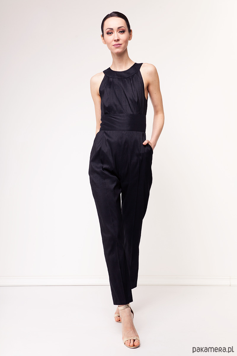 Ekskluzywny kombinezon z kolekcji specjalnej uszytej na tajski tydzień mody. Wykonany z tajskiego, ręcznie tkanego jedwabiu królewskiego w kolorze czarnym. Tkanina nie jest elastyczna, sztywna. Fason dopasowany, na wiskozowej podszewce. Góra dopasowana zakładkami, talia podkreślona szerokim pasem, zamek kryty z tyłu, dyskretnie odkryte plecy. Dół z kieszeniami i nogawkami w kant.