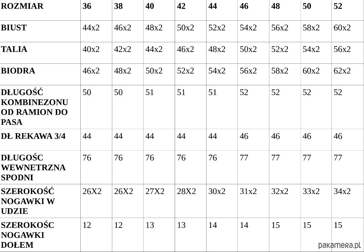 WYMIARY KOMBINEZONU MIERZONE NA PŁASKO BEZ ROZCIAGANIA