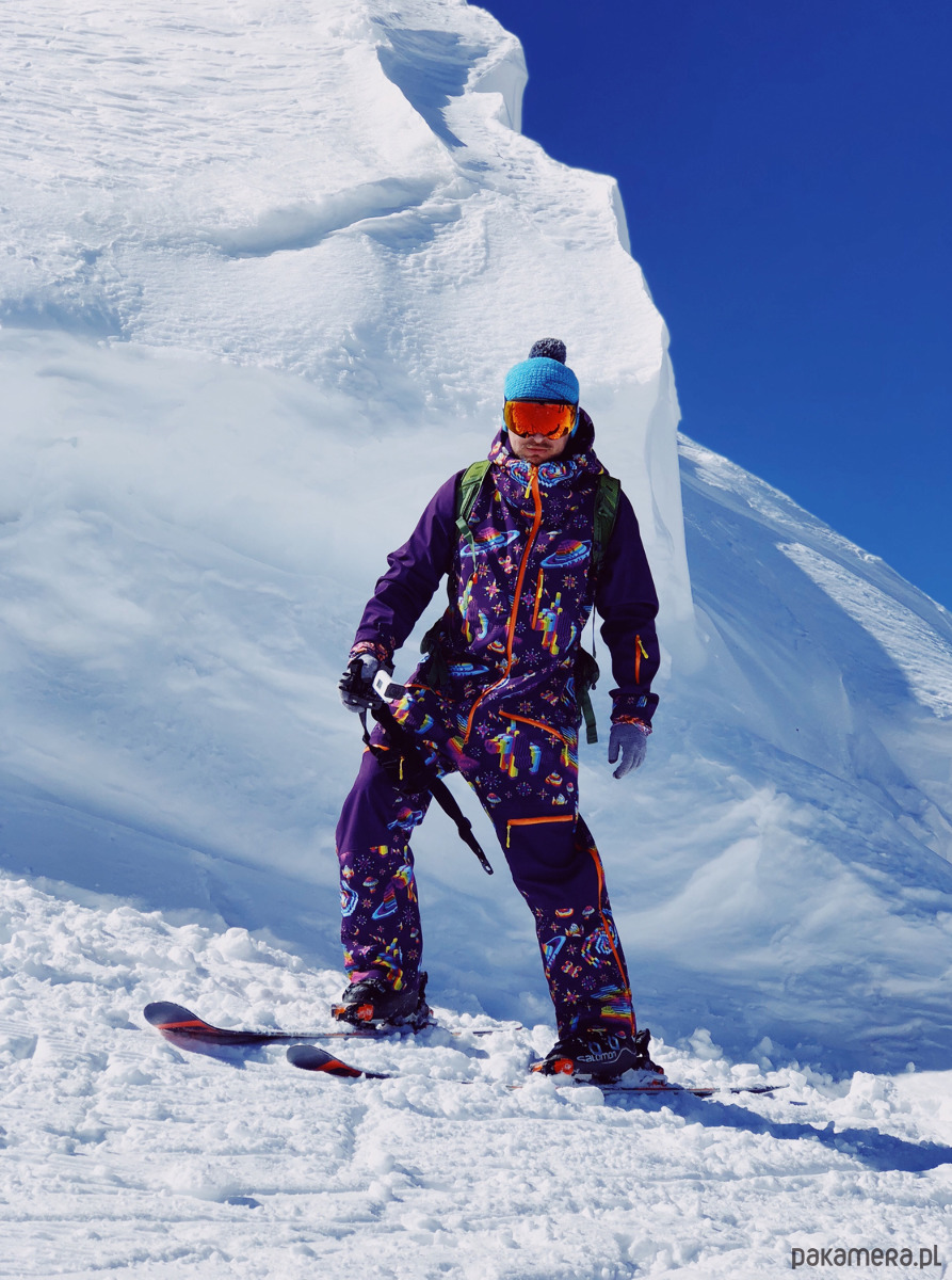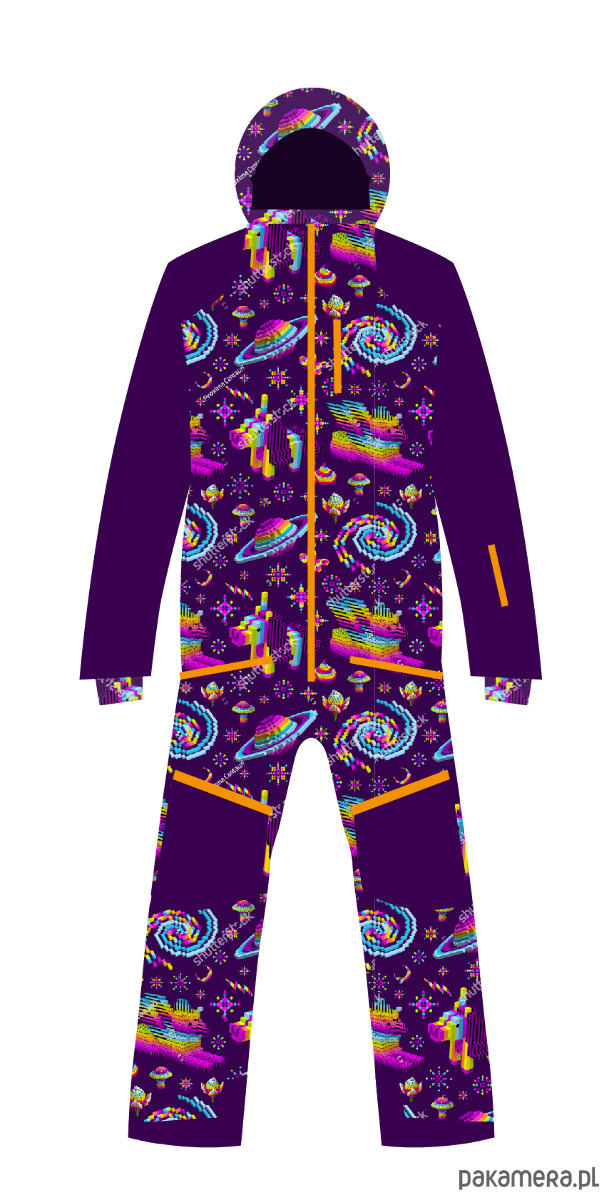 Szyty na miarę, softshellowy kombinezon narciarsko-snowboardowy wyposażony w wywietrzniki pod pachami, wysoko rozpinane, ułatwiające zakładanie butów nogawki, fartuchy śnieżne w nogawkach oraz kieszeń na karnet narciarski. W rękawach wszyte są czarne lub turkusowe mankiety. Kombinezon w załączoną w zdjęciach grafikę stworków.