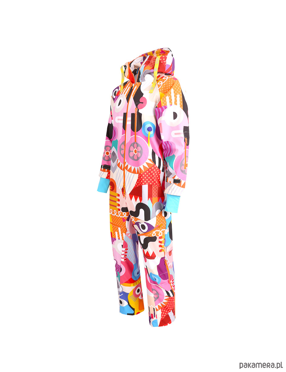 Szyty na miarę, softshellowy kombinezon narciarsko-snowboardowy wyposażony w wywietrzniki pod pachami, wysoko rozpinane, ułatwiające zakładanie butów nogawki, fartuchy śnieżne w nogawkach oraz kieszeń na karnet narciarski. W rękawach wszyte są czarne lub identyczne z wzorem, zintegrowane, kolorowe mankiety.