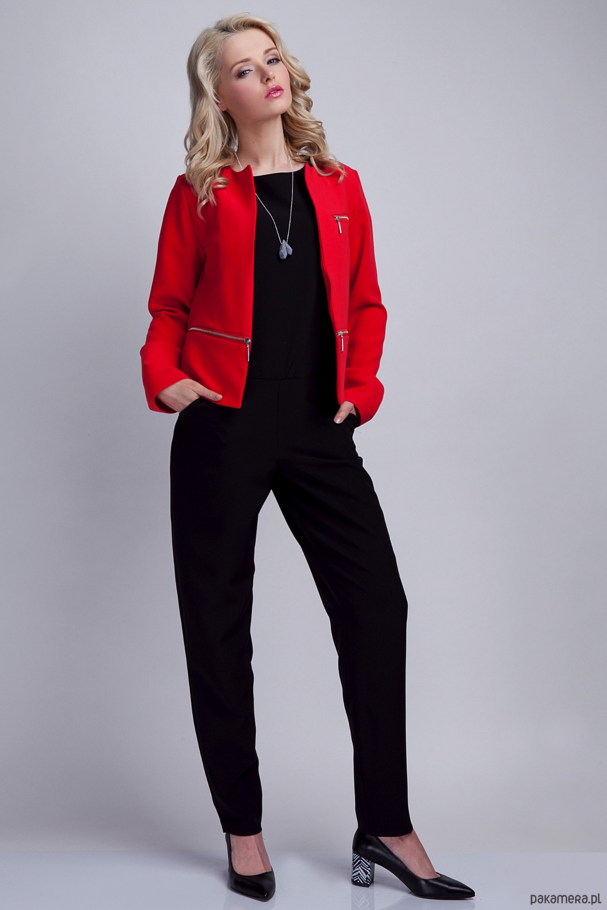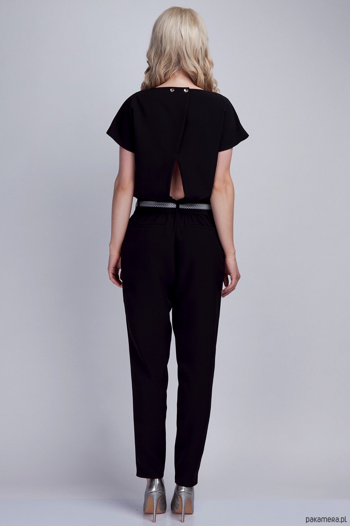 Elegancki kombinezon z oryginalnym rozcięciem na plecach, które seksownie odsłania plecy. Ozdobna szarfa w talii, praktyczne boczne kieszenie. Fason, który sprawdzi się zarówno na co dzień, jak i na specjalne okazje. Tkanina Premium.