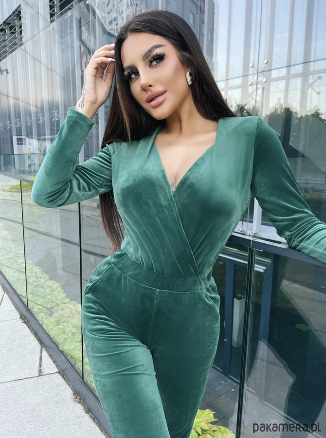 Kombinezon z głębokim dekoltem i kołnierzem wykonany z niezwykle miękkiego i przyjemnego w dotyku weluru. Elegancki, a zarazem wygodny model.