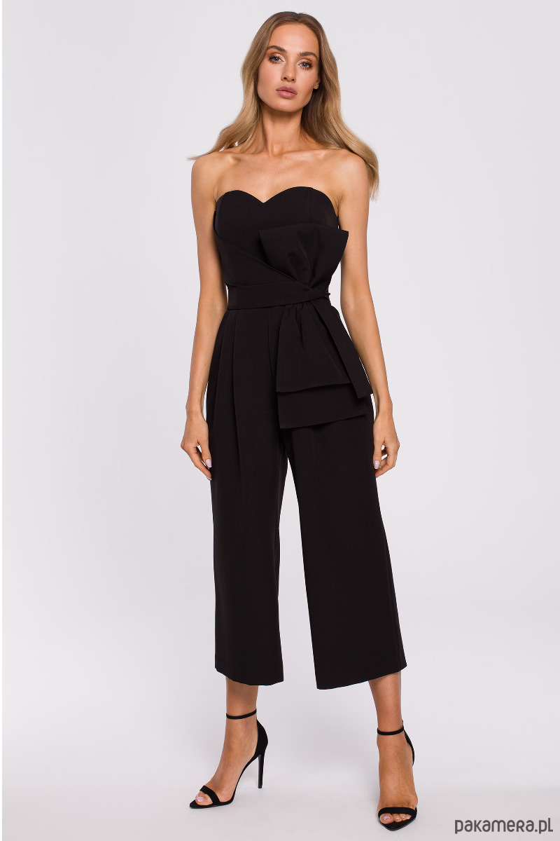 Przełam stereotypy i wyraź się poprzez swój strój! Ten kombinezon ma tę moc! Efektowna gorsetowa góra z mocnymi detalami takimi jak: drapowana kokarda i pasek wiązany wokół talii, a do tego szerokie nogawki długości 7/8 podkreślą Twój indywidualny styl.