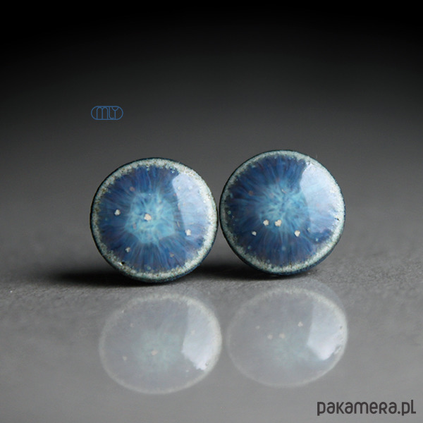 Ceramiczne okrągłe kolczyki w formie sztyftów, ręcznie wykonane z delikatnej gliny kamionkowej, jednostronnie szkliwione mieszanką zielono błękitnych szkliw z efektem plamek, na antyalergicznych sztyftach w kolorze srebrnym. Średnica ok. 9mm. Polecam