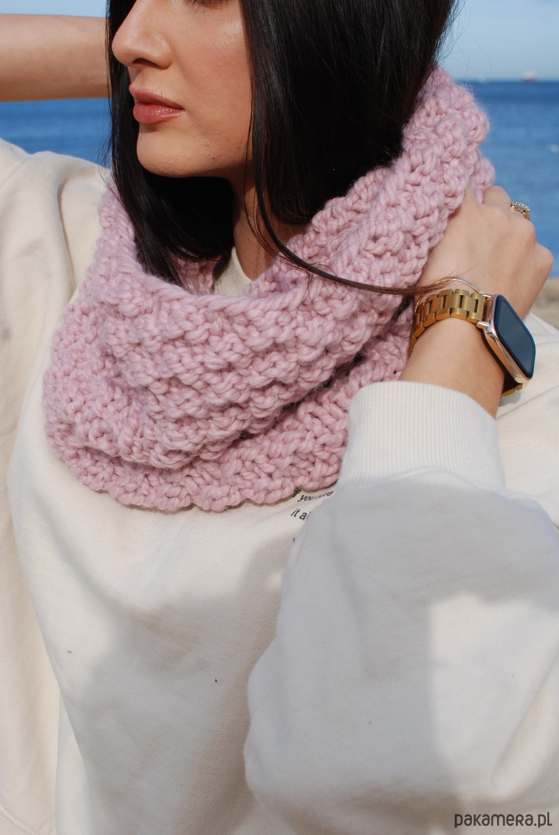 Mięsisty komin FLOSSY RÓŻ o ciekawym splocie. Ciepły, miły i pięknie się układa. NIE GRYZIE ! ! ! Wykonany w 100% ręcznie z miękkiej włóczki , wełny z domieszką akrylu o. Klasyczny fason w połączeniu z ozdobnym splotem, będzie pasował do wielu stylizacji. :) Możliwość skomponowania czapki lub opaski do kompletu , mitenek i rękawiczek . Realizujemy zamówienia na inne wersje kolorystyczne.