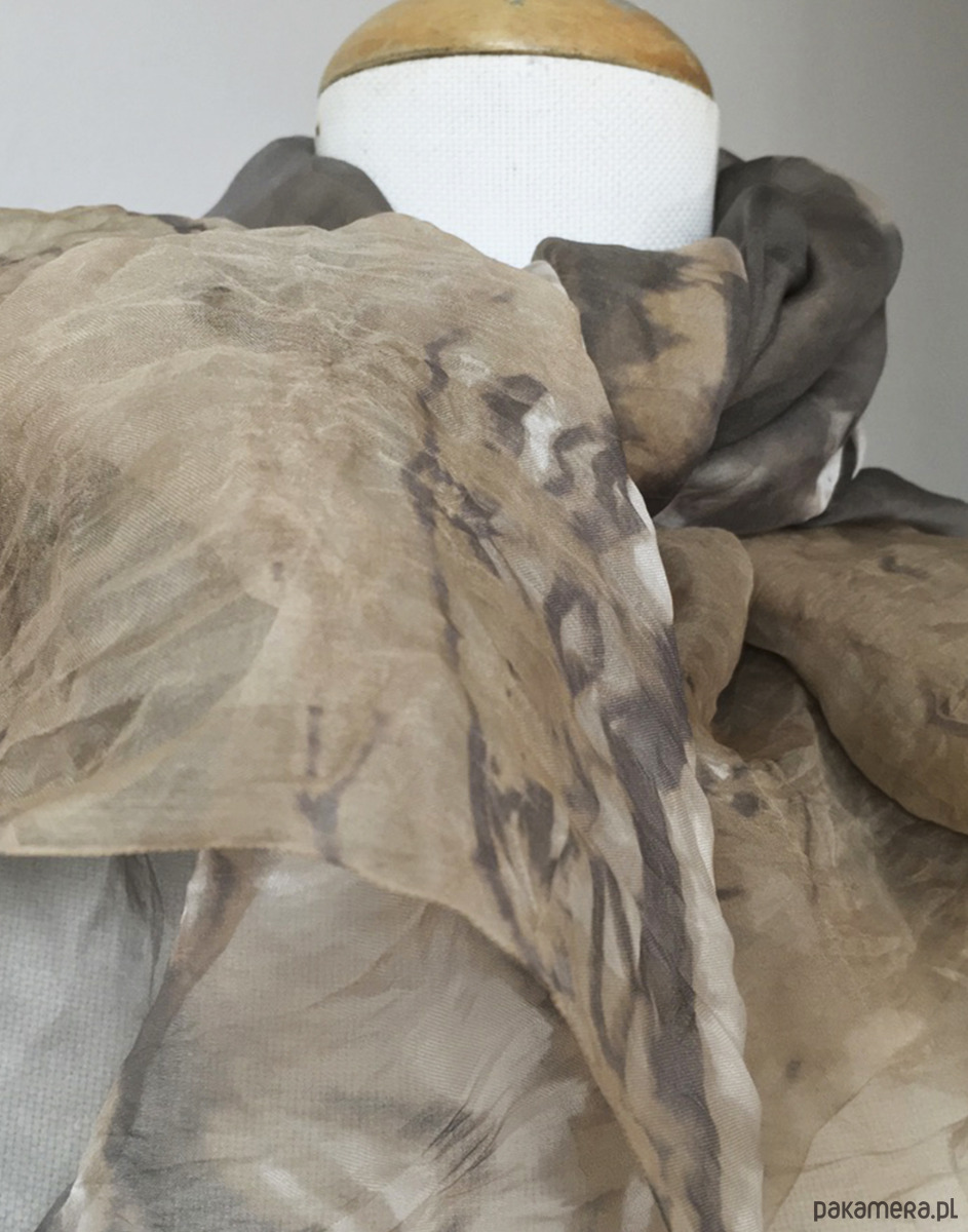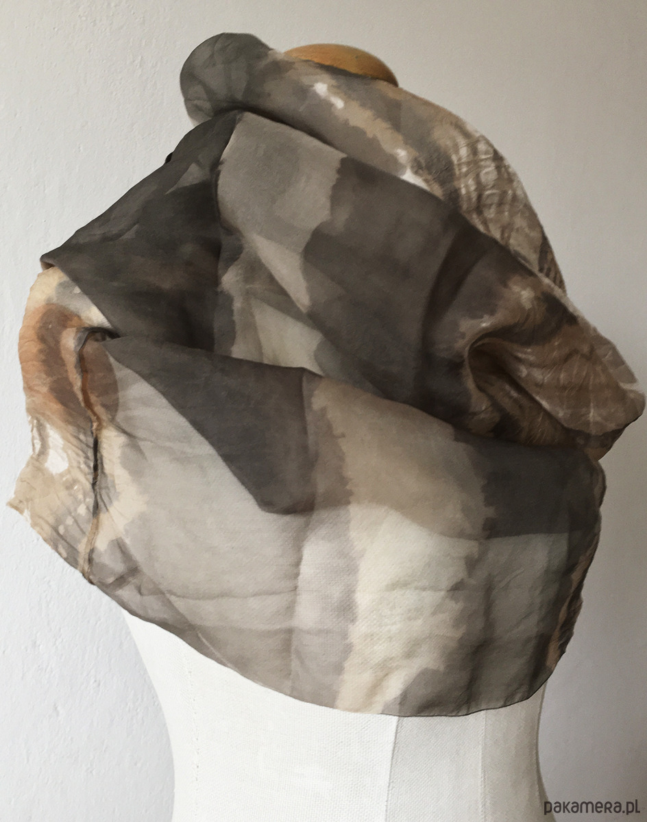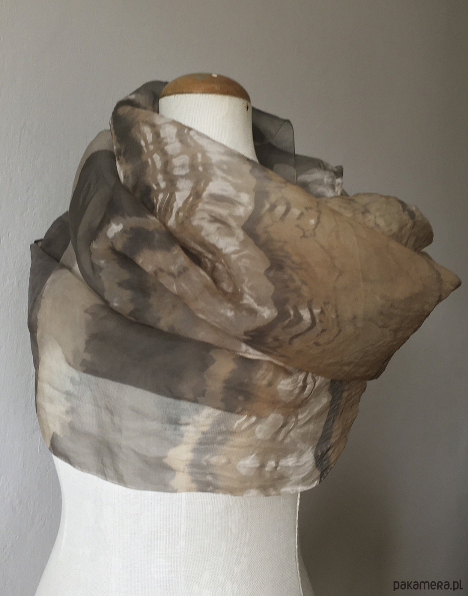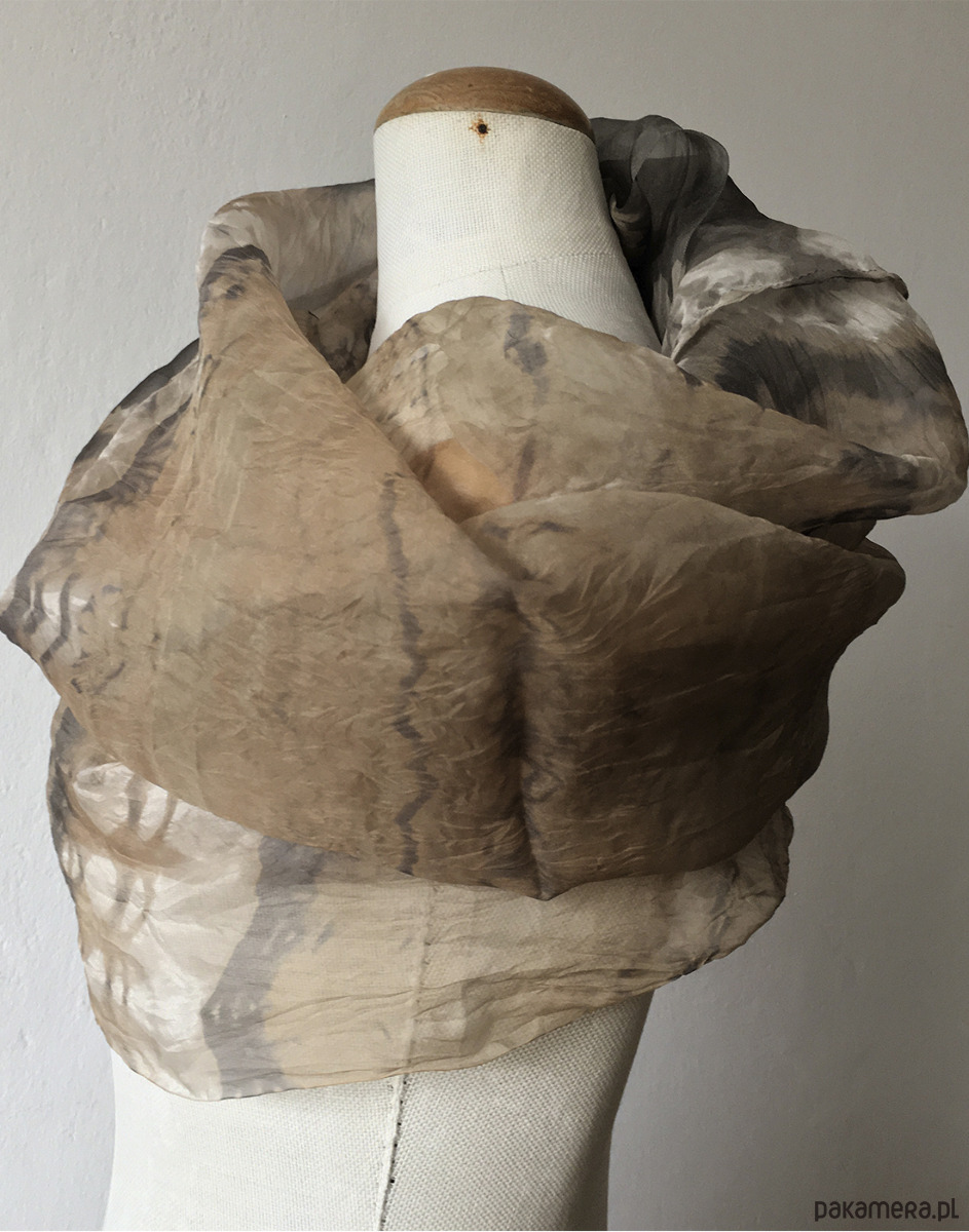 Mój wynalazek z serii ‘’muszę za 5 minut wyjść i nie wiem co założyć’’ Ni to szal, ni to komin. Szalo-komin TRACE. Wygląda jak otulająca mgiełka. Można nosić jako szal, apaszkę, kaptur i nigdy nie spada z ramion : ) NIC nie waży i nie zajmuje miejsca - wepchniesz go do kieszeni plecaka wsiadając do samolotu. Uszyty z transparentnej organzy jedwabnej ( 100 % pure Silk ) Wykonany techniką shibori. Wymiary : długość 100 c , obwód 100 cm. Kolory szary, piaskowy, delikatny khaki - mało kontrastowy, bardzo malarski w charakterze.