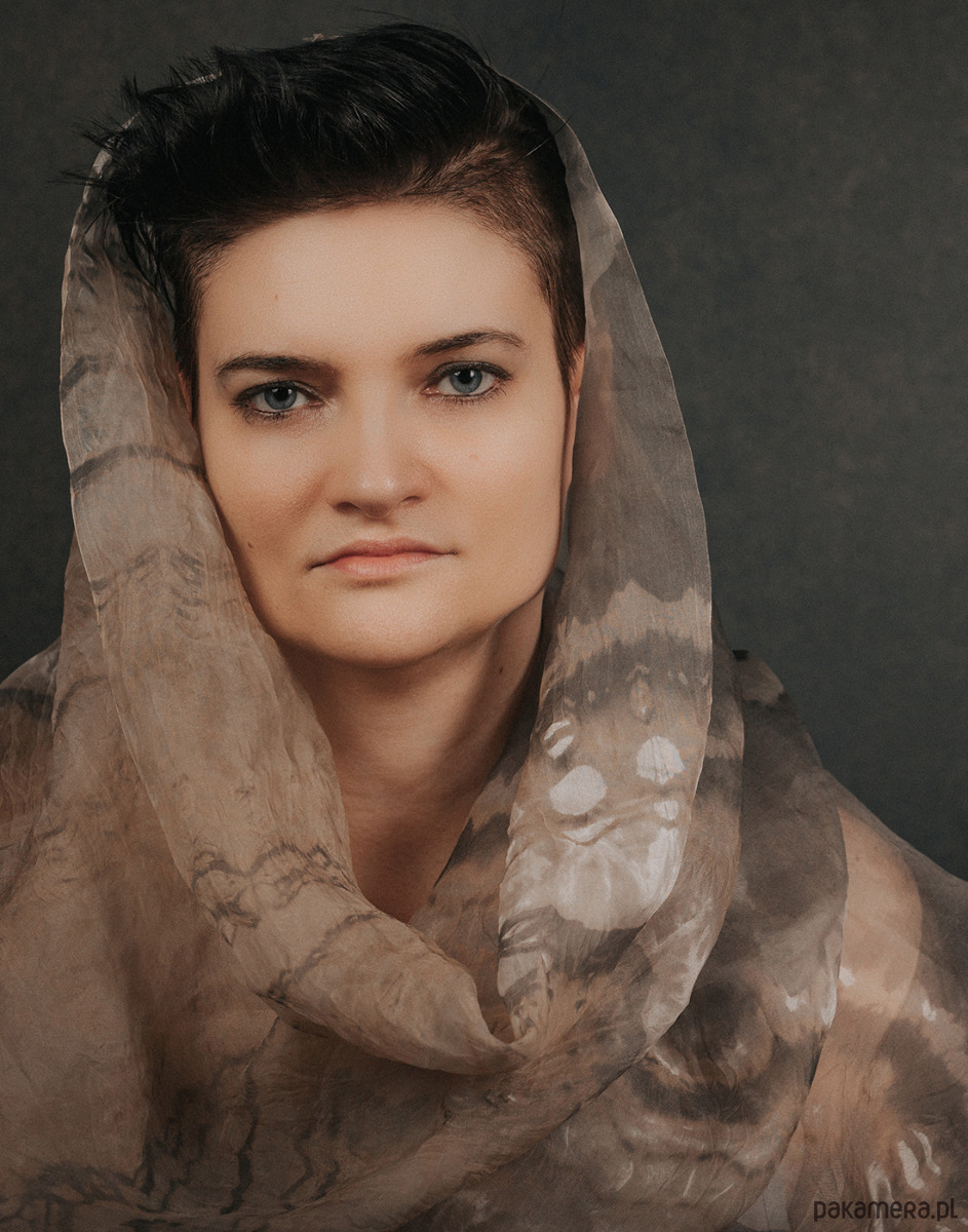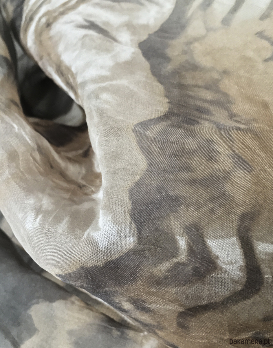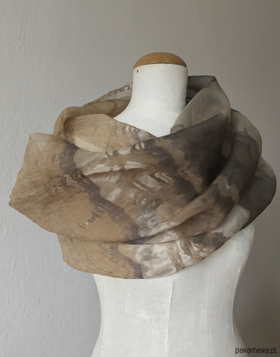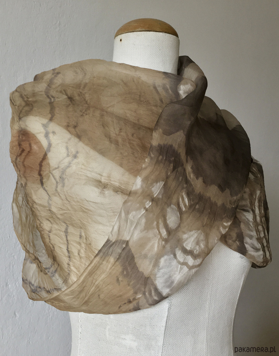 Mój wynalazek z serii ‘’muszę za 5 minut wyjść i nie wiem co założyć’’ Ni to szal, ni to komin. Szalo-komin TRACE. Wygląda jak otulająca mgiełka. Można nosić jako szal, apaszkę, kaptur i nigdy nie spada z ramion : ) NIC nie waży i nie zajmuje miejsca - wepchniesz go do kieszeni plecaka wsiadając do samolotu. Uszyty z transparentnej organzy jedwabnej ( 100 % pure Silk ) Wykonany techniką shibori. Wymiary : długość 100 c , obwód 100 cm. Kolory szary, piaskowy, delikatny khaki - mało kontrastowy, bardzo malarski w charakterze.
