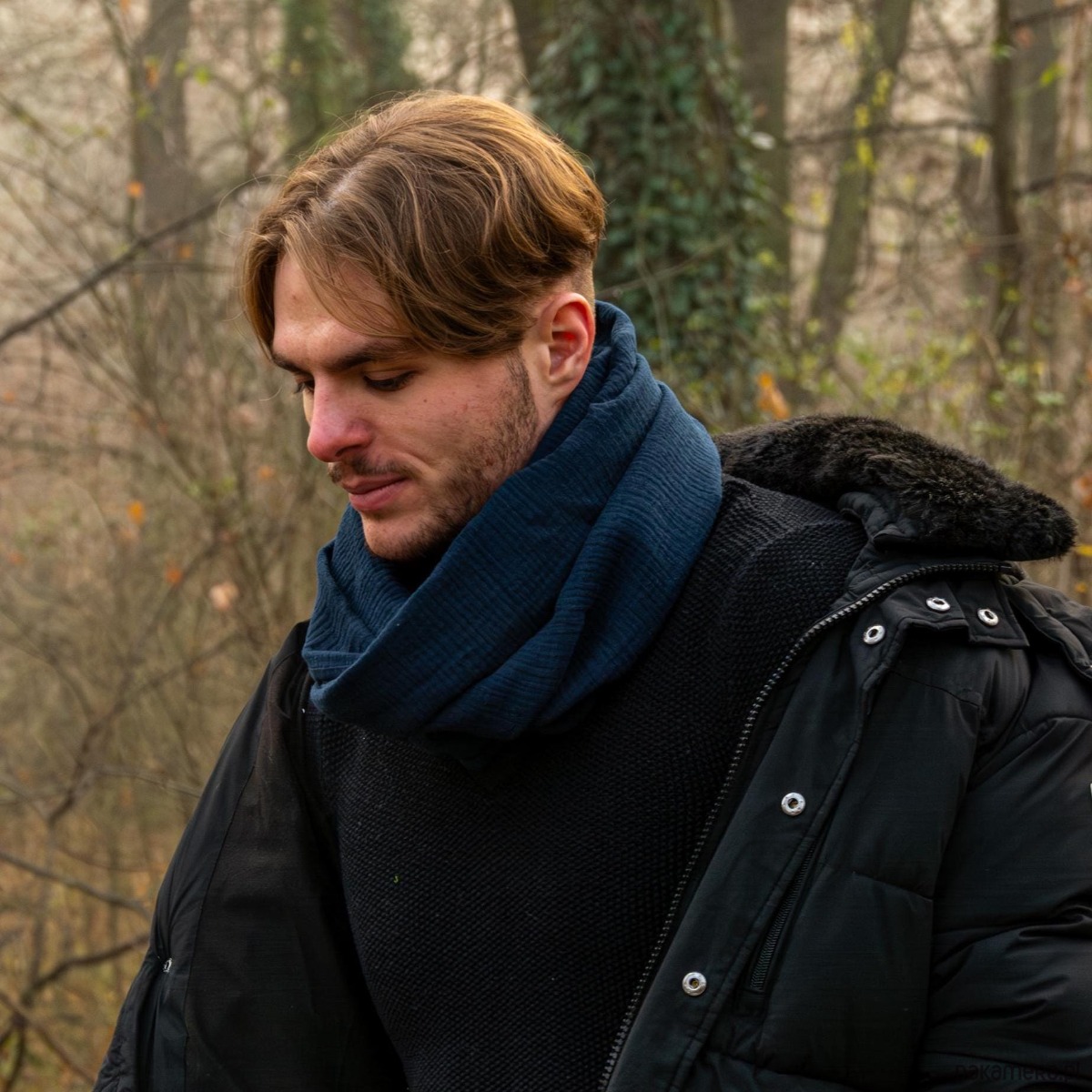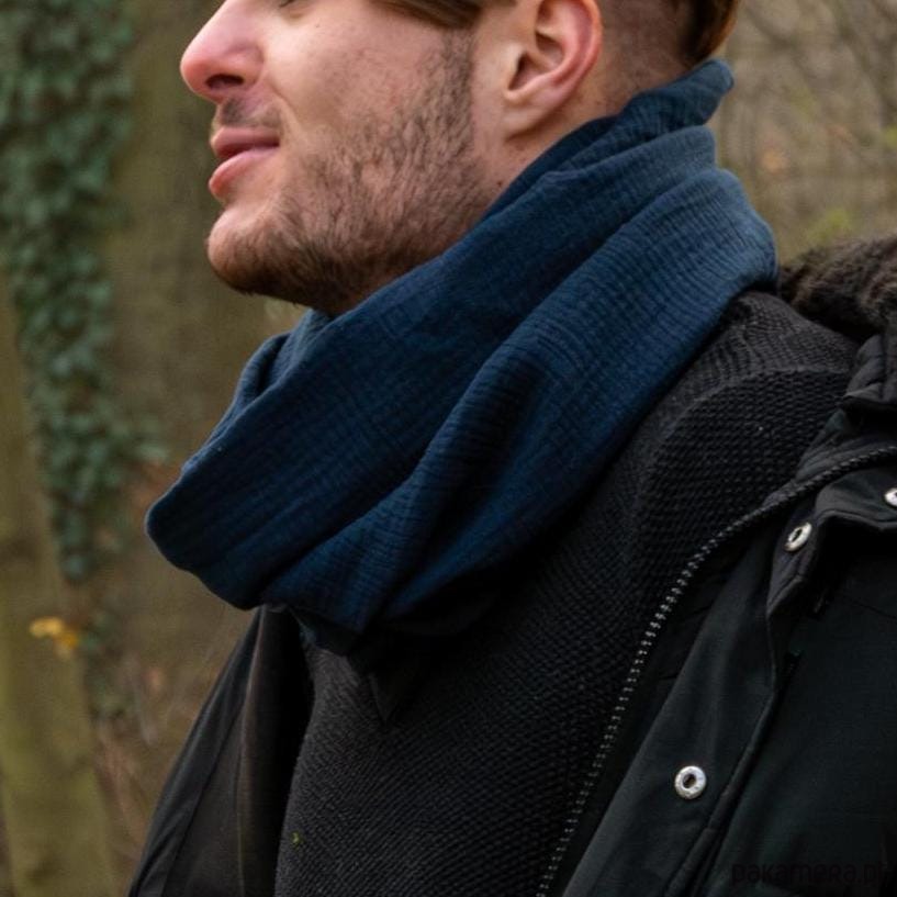 Bawełniany szalik nadaje się do noszenia o każdej porze roku. Niebieski szalik można owinąć wokół szyi 2 razy. Dostępne są różne kolory tkaniny. Przytulny szalik jest uszyty w kształcie ósemki, Ósemka Okręcany. Długość szalika po złożeniu wynosi 75 cm (pomiar, gdy szalik leży podwójnie na podłodze), wysokość 48 cm (+-1 cm). Tkanina jest dwuwarstwowa, dzięki czemu szalik jest wystarczająco ciepły, ponieważ jest dwukrotnie owinięty wokół szyi i izoluje szyję. Naturalny muślin jest tkaniną antyalergiczną, jest bardzo przyjemny dla ciała i nie kłuje. Szalik uzupełni każdy wizerunek zarówno kobiet jak i mężczyzn. Szalik jest idealnym prezentem dla każdej osoby.