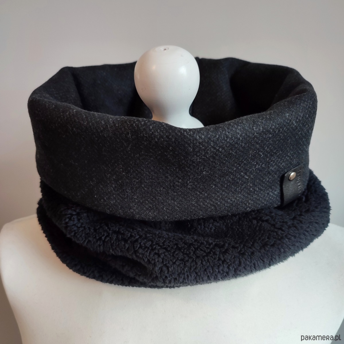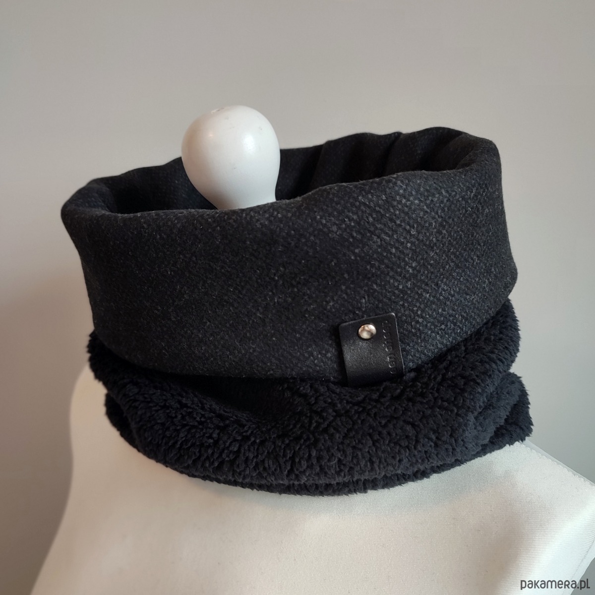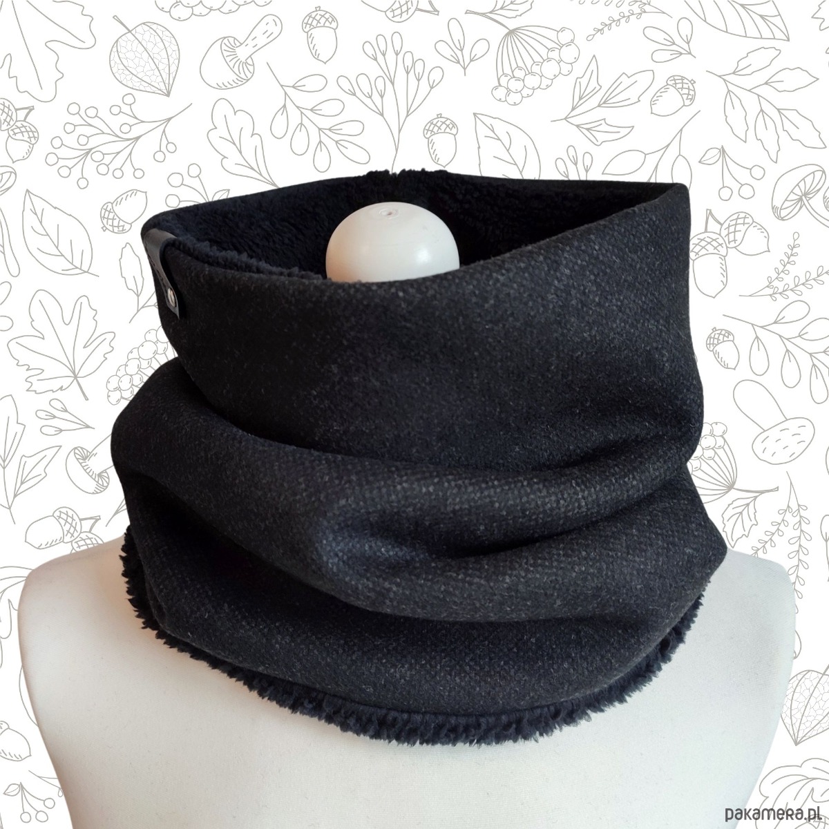 Bardzo starannie wykonany komin wykonany z 2 warstw materiału. Wierzchnia - gładka tkanina wełniana (włoska, super jakości) w kolorze czarnym; spód z bardzo miękkiej, miłej w dotyku i ciepłej tkaniny imitującej baranka. Szal zdobiony jest ręcznie tłoczoną metką z naturalnej skóry w kolorze czarnym.